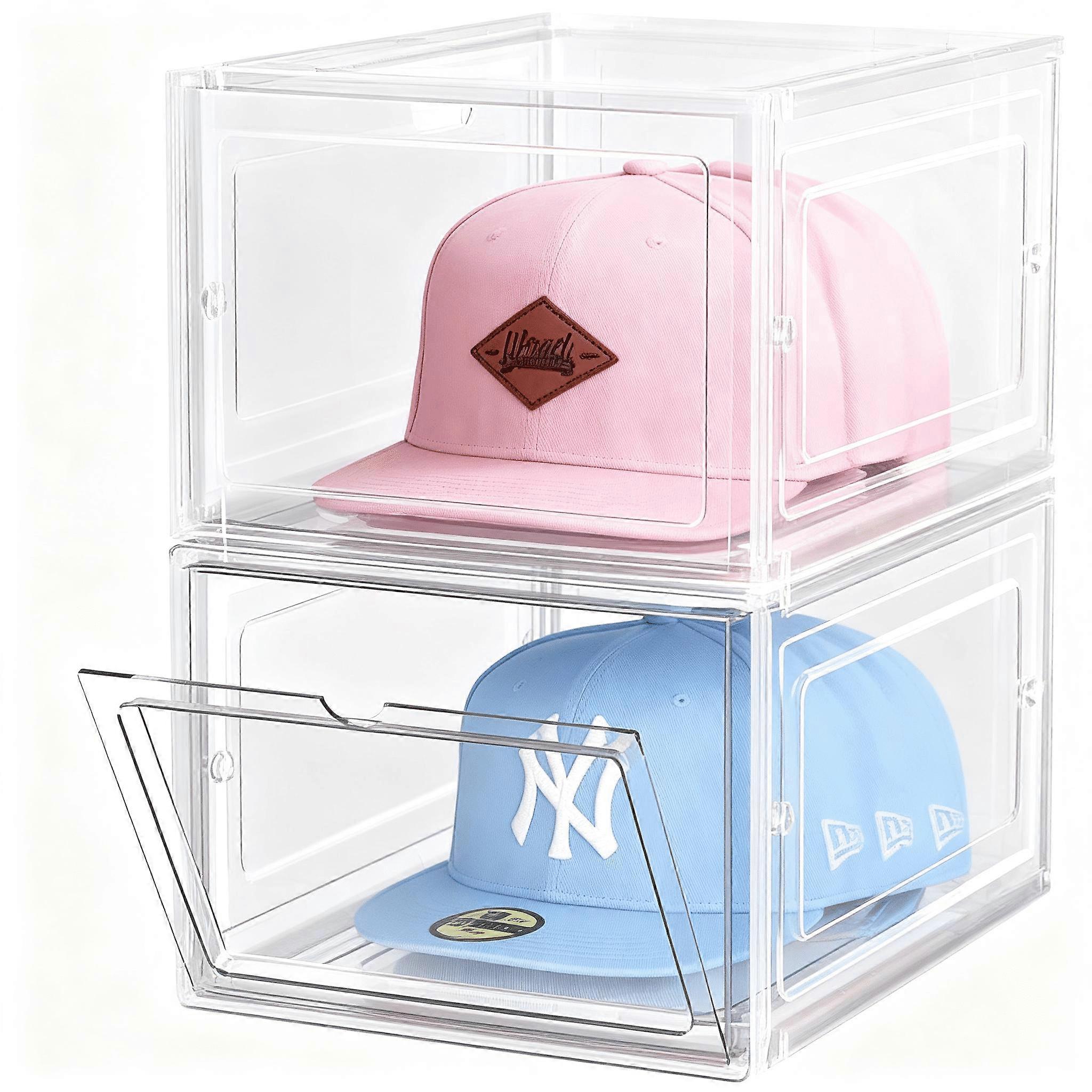 Stackable Clear Hat Organizer Box with Magnetic Door, Holds 8 Caps Each – 2 Pack, Compatible with Snapback & Baseball Caps