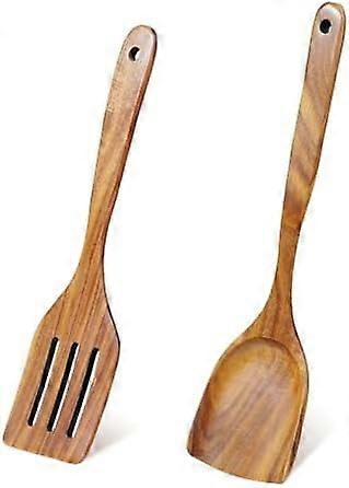 2 Pcs Wooden Spatula Set – Natural Teak & Slotted Turner, Compatible with Non-stick Cookware