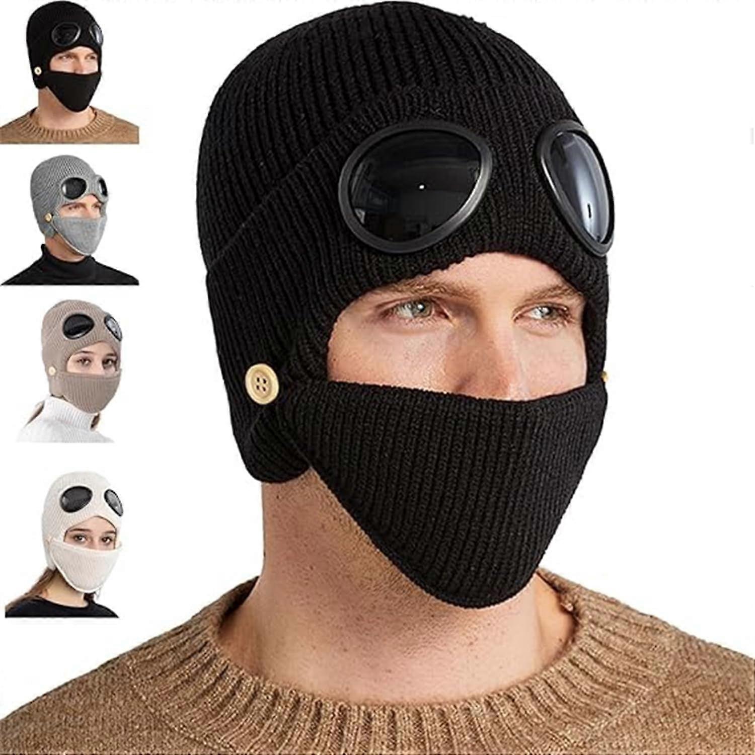 3-in-1 Unisex Knitted Goggle Beanie Hat, Winter Warm Outdoor Sports Fashion Aviator Hat with Ear Flaps and Detachable Face Mask Features: 3-in-1 Unisex Knitted Goggle Beanie Hat 1. Built-in Goggles – Windproof and warm, unique design 2. Fully Knitted for Warmth – Comfortable, elastic, and soft, suitable for cold weather 3. Unisex Design – Suitable for men, women, and children 4. Suitable for Outdoor Activities – Skiing, hiking, commuting 5. Three Wearing Styles – Goggles up, goggles down, or worn as a classic beanie Specifications: 3-in-1 Unisex Knitted Goggle Beanie Hat Material: Acrylic Colors: Khaki, Gray, Beige, Black Head Circumference: 56–59 cm (Elastic and adjustable) Hat Height: 27 cm / 10.63 inches Face Mask Size: 22*10 cm / 8.66*3.94 inches Goggle Size: 7*6 cm / 2.76*3.62 inches Package Includes: 1 x 3-in-1 Unisex Knitted Goggle Beanie Hat Notes: 1. Please allow slight errors due to manual measurement. 2. Due to differences in monitors and lighting effects, the actual color may slightly differ from the picture. Welcome to our store! If you have any questions, please feel free to email us. Happy shopping! Three-in-One All-Around Protection, Perfect for Winter Outdoor Activities: This unisex three-in-one knitted hat (beanie with goggles) combines a winter hat, goggles, and face mask into one, reducing glare from bright snow and protecting your eyes while keeping you warm. It covers your head, ears, and face, effectively blocking cold, wind, and dust; suitable for skiing, hiking, commuting, and various other occasions, providing easy warmth. Ultra-Soft and Comfortable, Long-Lasting Warmth: This winter warm knitted hat with built-in goggles is made of high-quality acrylic fabric and a comfortable cotton lining, providing instant soft and skin-friendly comfort. The tight knit design helps lock in heat, keeping you warm during prolonged outdoor activities and effectively blocking cold air. Reversible Functional Goggles and Four Wearing Styles: This winter hat with goggles features clear, reversible lenses for a wide field of vision, protecting your eyes from wind and debris. The integrated face mask can be folded up or down; four wearing styles adapt to different scenarios such as snow sports, commuting, and walking, suitable for both men and women, providing a flexible and convenient warming solution for winter travel. Unisex Stretch Fit Design and Stylish Neutral Style: This winter face mask hat with goggles has a circumference of 22.05"-23.23" (56-59 cm), is highly elastic, and comfortably fits most adult heads, suitable for both men and women without feeling tight. The stylish neutral design complements various coats/jackets, enhancing winter looks for all genders. Durable Winter Essential and Thoughtful Unisex Gift Choice: This unisex knitted hat with goggles (three-in-one knitted hat) is a durable essential for winter outdoor activities. It's a thoughtful gift for friends and family who love winter activities, combining functionality, warmth, and style.