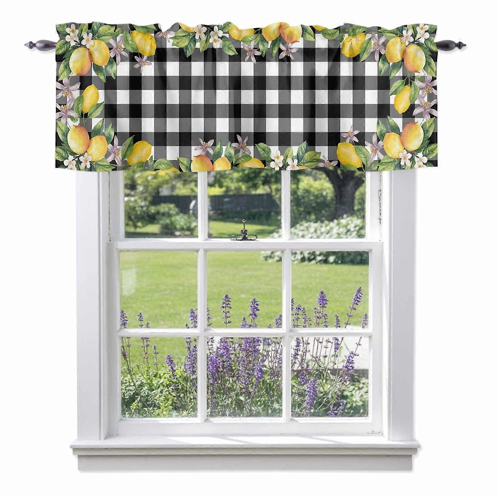 Summer Lemon Flower Black Buffalo Plaid Valance, Rod Pocket, 54x18in, for Kitchen, Bedroom, Bathroom, Living Room