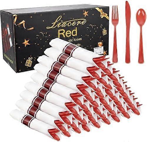 400PCS Pre-Rolled Red Cutlery Set w/ Napkins (100Forks, 100Knives, 100Spoons, 100Napkins) – Disposable Plastic Utensils for Wedding & Valentine’s
