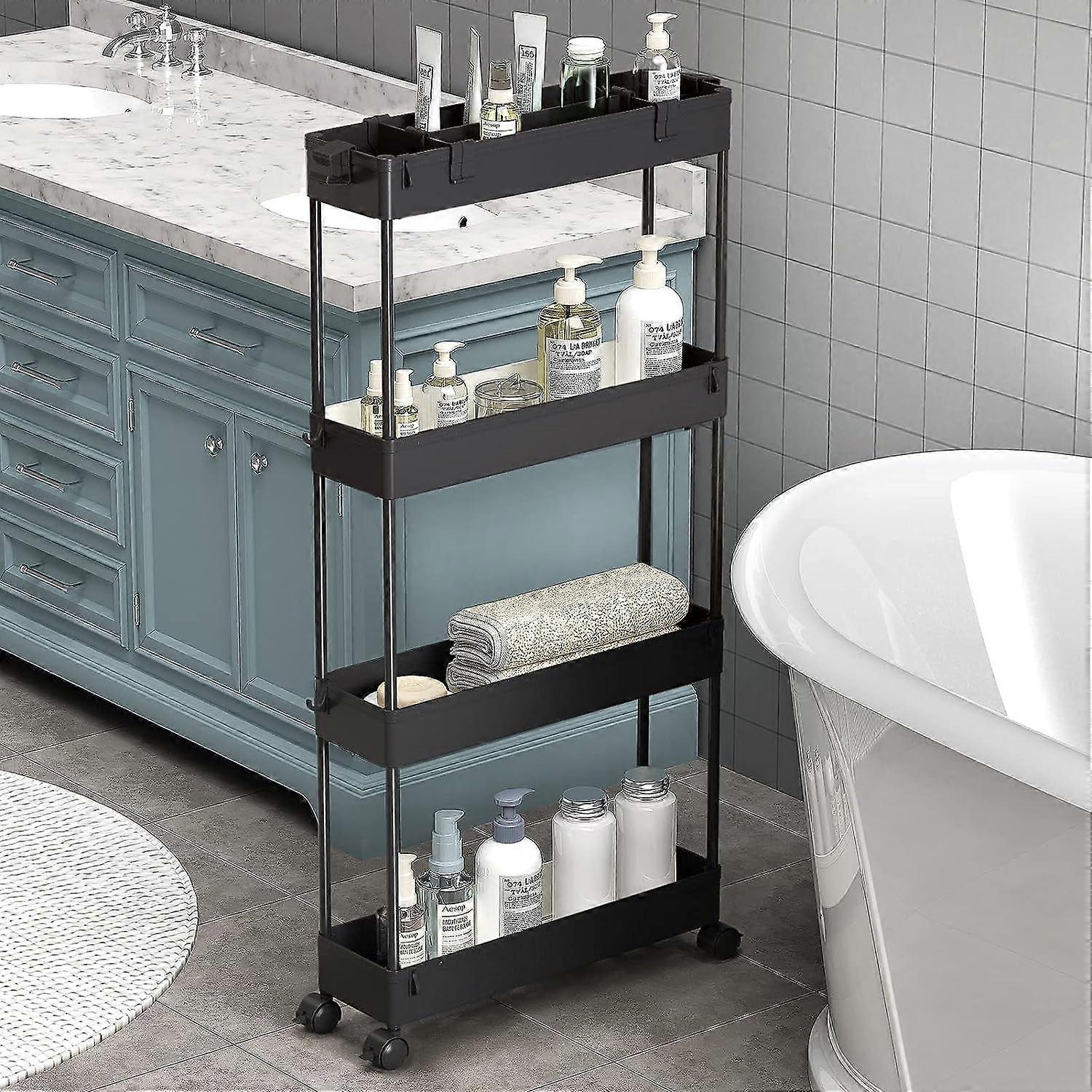 Flexible Slim Storage Cart: The bathroom rolling utility cart is equipped with 360°rotating wheels, the storage cart can be moved to any corner of the house to store items. You can flexibly use it for storage in office, bathroom, laundry room, kitchen, narrow places,etc Abundant Storage Space: The bathroom storage cart provides an extra layer of compartments, you can easily and rationally plan your space to store the required items, and quickly access them at a glance. The side hoops (included) can also provide you with more external storage space Multifunctional Storage Cart: Rolling storage utility cart is not just a cart, it can be adjusted to 2 or 3 layer shelf after removing the casters. The partical small utility cart can be used as bathroom dresser, kitchen spice rack to keep your space organized. Easy to Install: The mobile utility cart is made of high-quality plastic, providing you with stable and durable quality. At the same time it is very easy to install, so you can easily install successfully without additional tools Mesh Hollow Design: The storage trolley bottom adopts a mesh hollow, bid farewell to the residue of stagnant water during use, and keep things dry at all times Flexible Slim Storage Cart: The bathroom rolling utility cart is equipped with 360°rotating wheels, the storage cart can be moved to any corner of the house to store items. You can flexibly use it for storage in office, bathroom, laundry room, kitchen, narrow places,etc Abundant Storage Space: The bathroom storage cart provides an extra layer of compartments, you can easily and rationally plan your space to store the required items, and quickly access them at a glance. The side hoops (included) can also provide you with more external storage space Multifunctional Storage Cart: Rolling storage utility cart is not just a cart, it can be adjusted to 2 or 3 layer shelf after removing the casters. The partical small utility cart can be used as bathroom dresser, kitchen spice rack to keep your space organized. Easy to Install: The mobile utility cart is made of high-quality plastic, providing you with stable and durable quality. At the same time it is very easy to install, so you can easily install successfully without additional tools Mesh Hollow Design: The storage trolley bottom adopts a mesh hollow, bid farewell to the residue of stagnant water during use, and keep things dry at all times