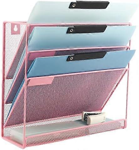 4-Tier Mesh Desk File Organizer, Hanging Wall-Mount Document Stand with Bottom Tray – Pink, Compatible with Office/Home Use