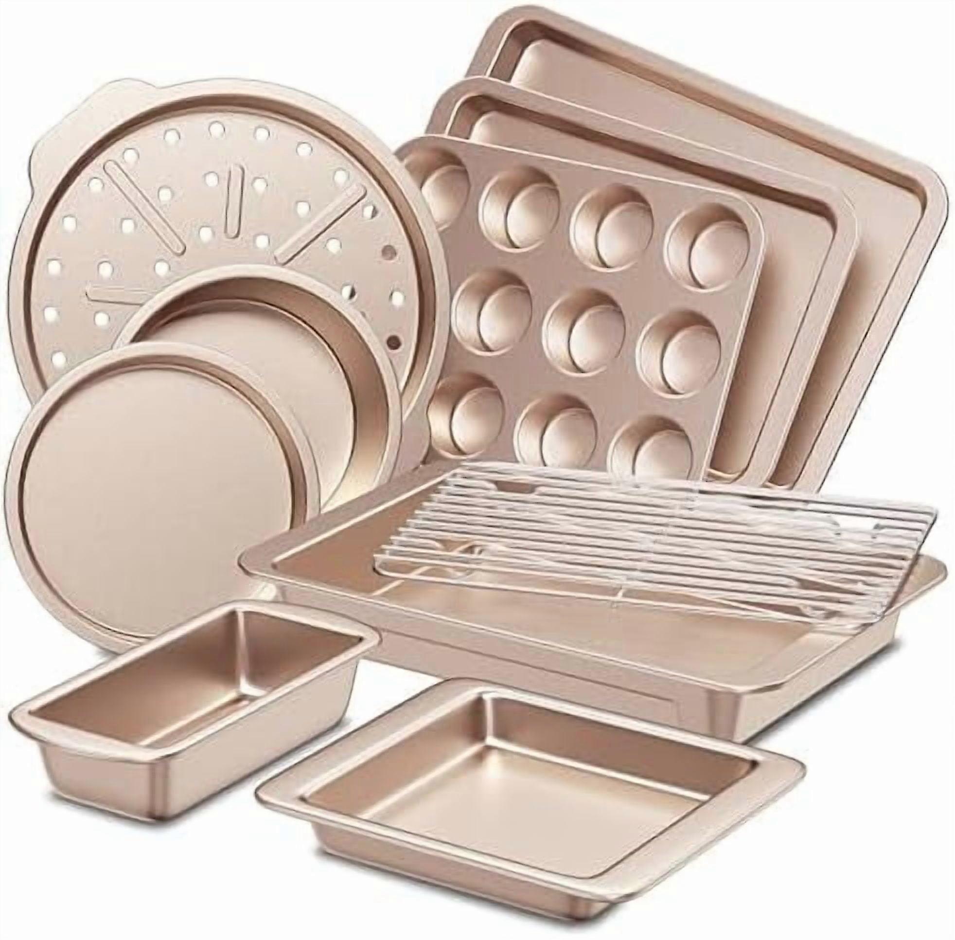 10-Piece Nonstick Bakeware Set with Wider Grips – Rack, Cookie Sheet, Cake/Loaf/Muffin/Pizza Pans – Champagne Gold