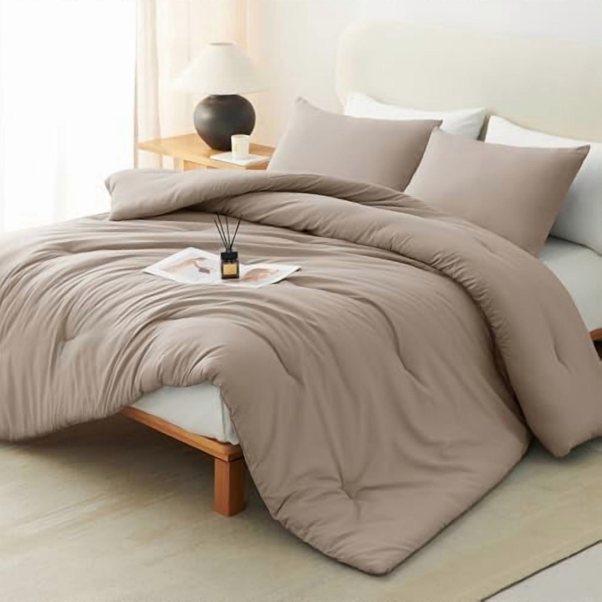 King Size Khaki Comforter Set (3 pcs): Breathable Quilted Down Alternative Comforter + 2 Pillowcases