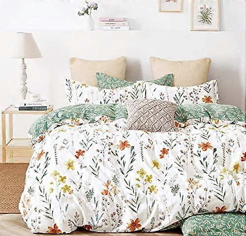 Duvet Cover Queen, 600 Thread Count Cotton 3pcs Bedding Set Yellow Flowers and Green Branches Printed on White Reversible Comforter Cover