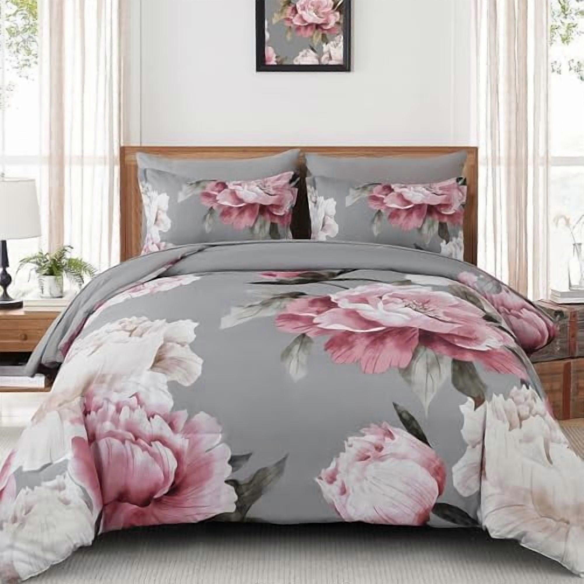 7-Pc Pink & Grey Floral Comforter Set Queen, Soft Microfiber Botanical Bedding, Compatible with All Seasons