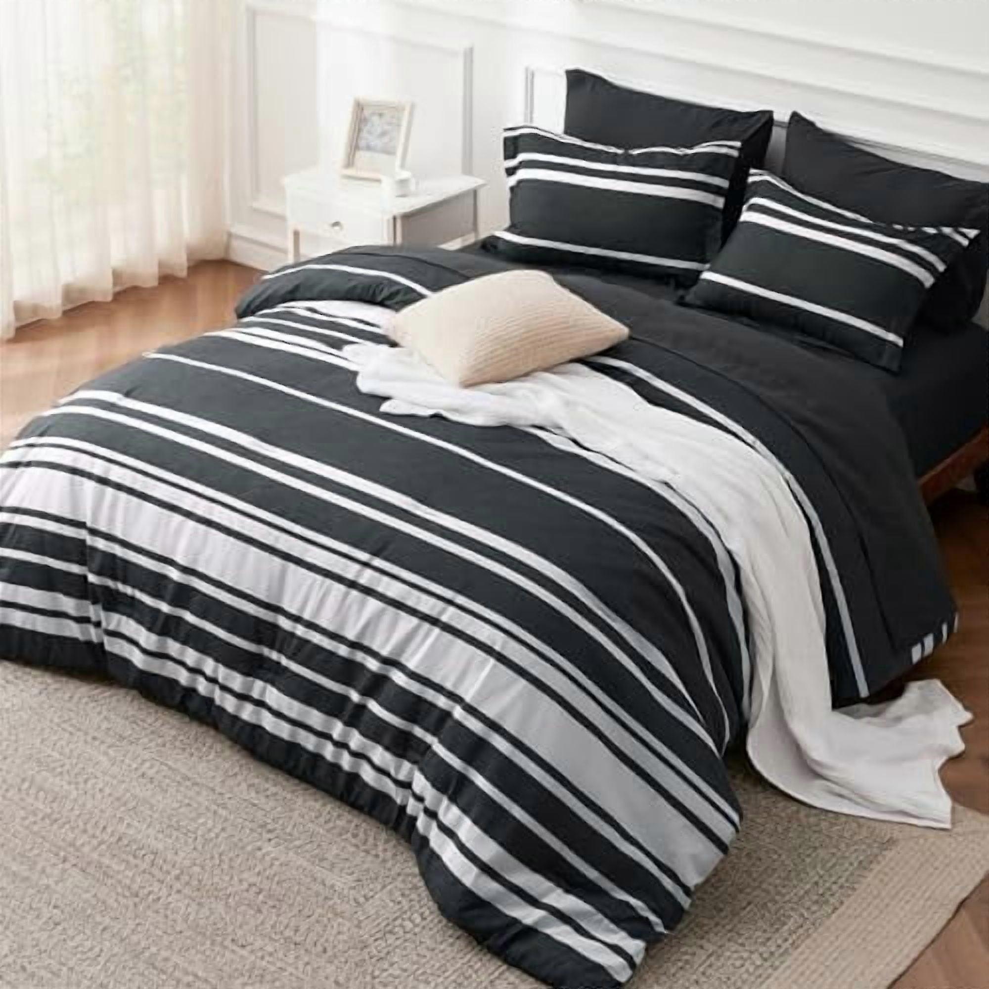 7-Pc Black Striped Reversible Comforter Set, Cationic Dyeing Bed in a Bag with Sheets, Pillowcases & Shams