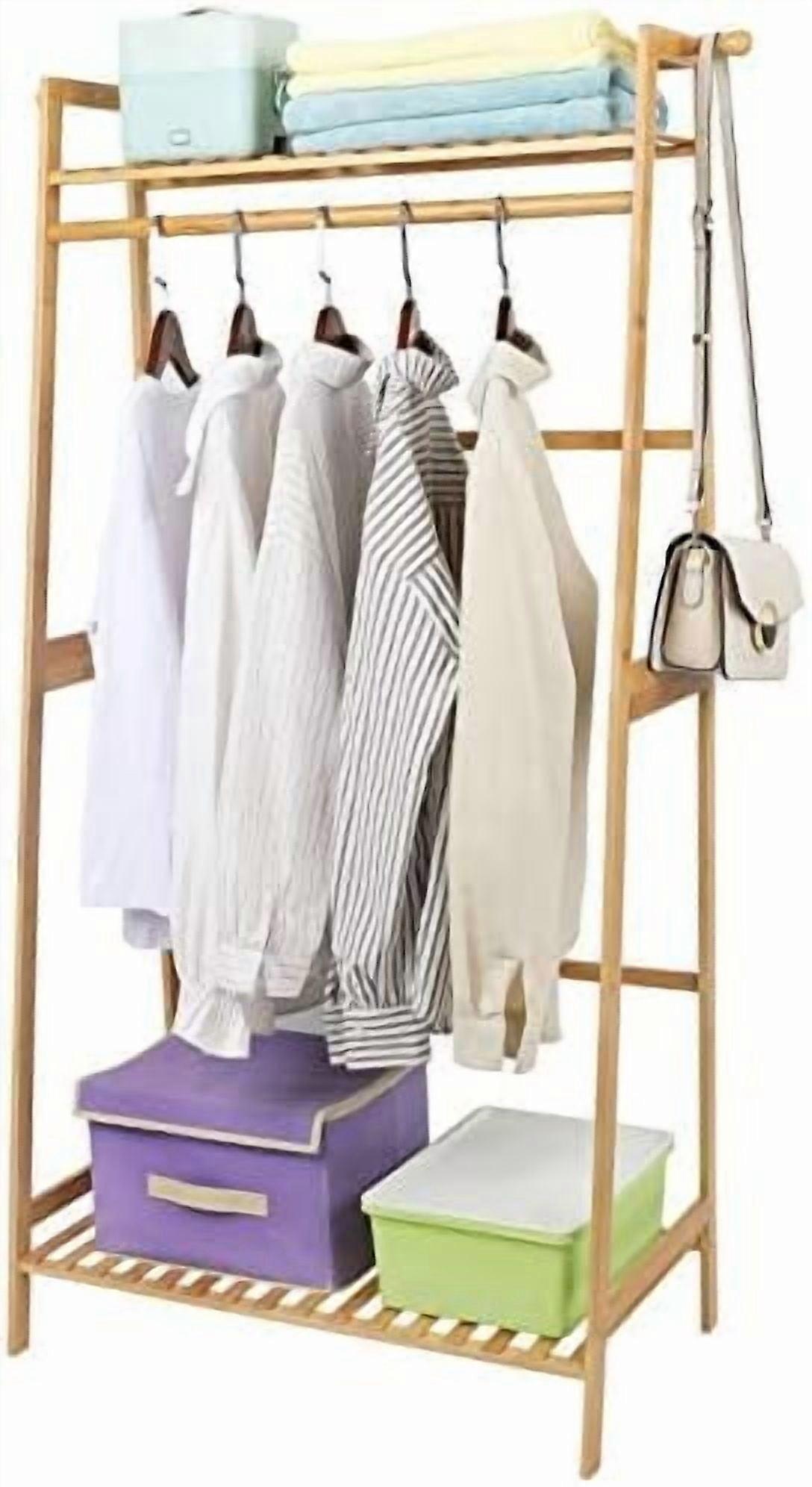 Bamboo Clothes Hanging Rack with 2 Tier Storage Shelves and 2 Coat Hooks Portable Laundry Rack Cloest Organizer Garment Rack for Bedroom Guest Room