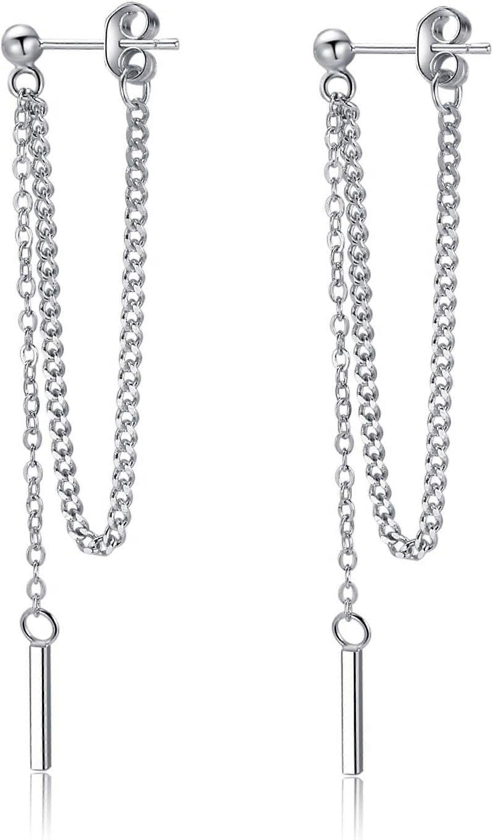 Solid 925 Sterling Silver Bar Dangle Earrings for Women Minimalist Dangle Earrings Threader Chain