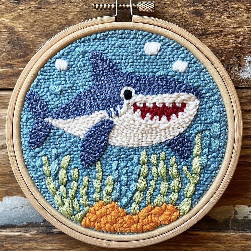 Cute Sea Shark Punch Needle Kit for Beginners – DIY Yarn Embroidery Set with Printed Pattern & Hoop (20x20cm), Compatible with Standard Punch