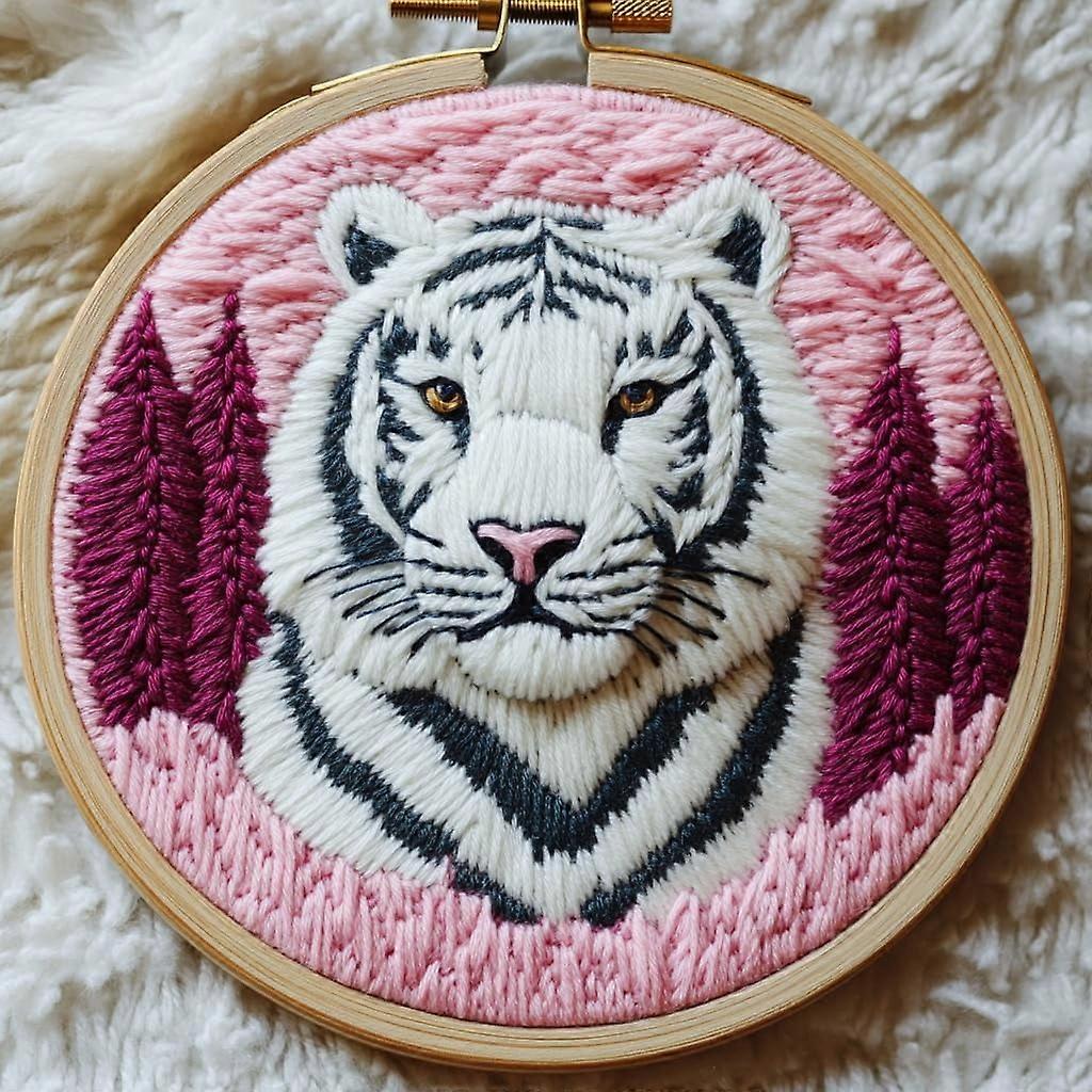 DIY Punch Needle Kit: Cartoon White Tiger & Red Trees, Easy for Beginners, Includes Hoop & Yarn – 20x20cm Embroidery Set