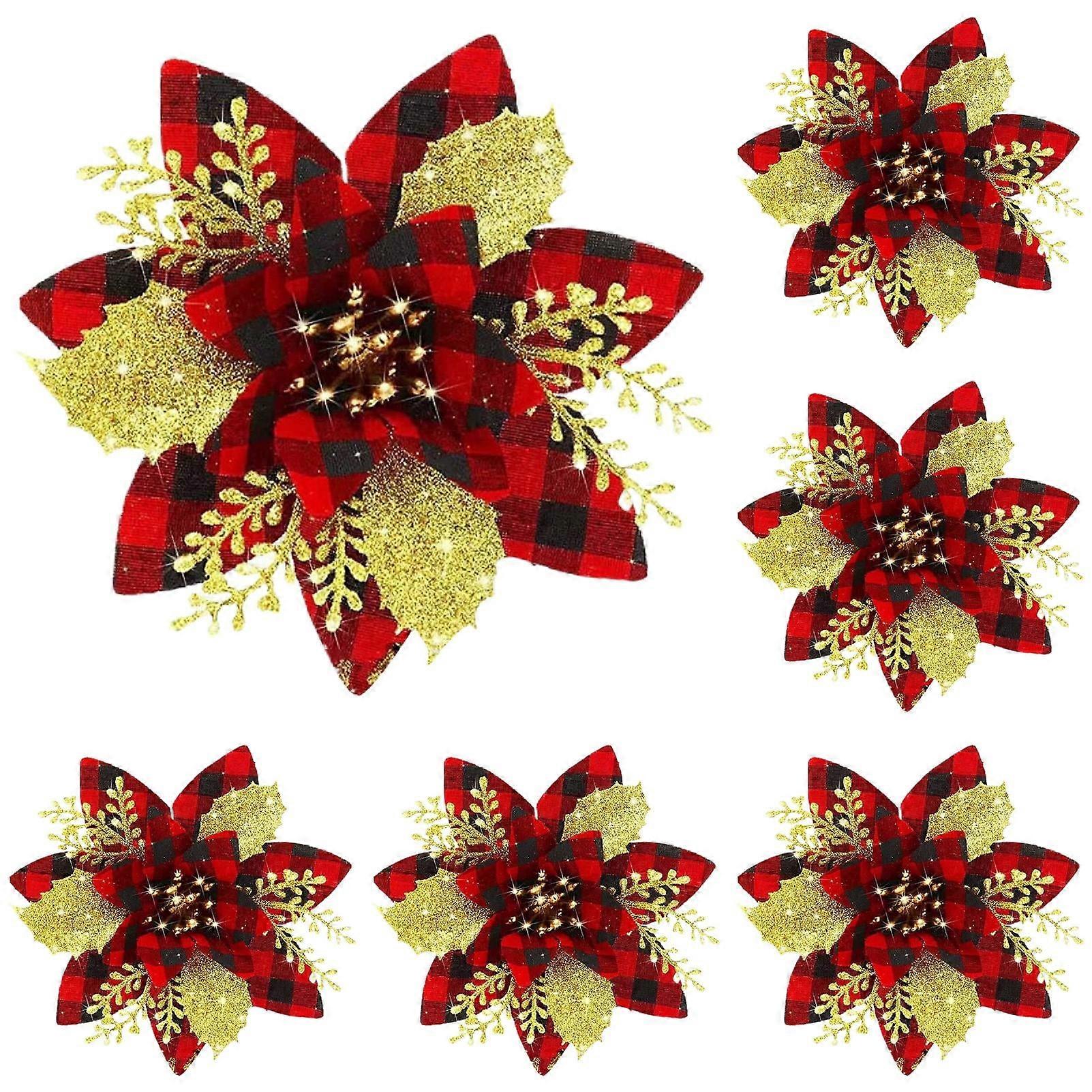 12Pcs 5.7in Artificial Poinsettias Christmas Glitter Flowers with Clips – Xmas Tree Ornaments, Holiday Garland & Home Decor Decorations