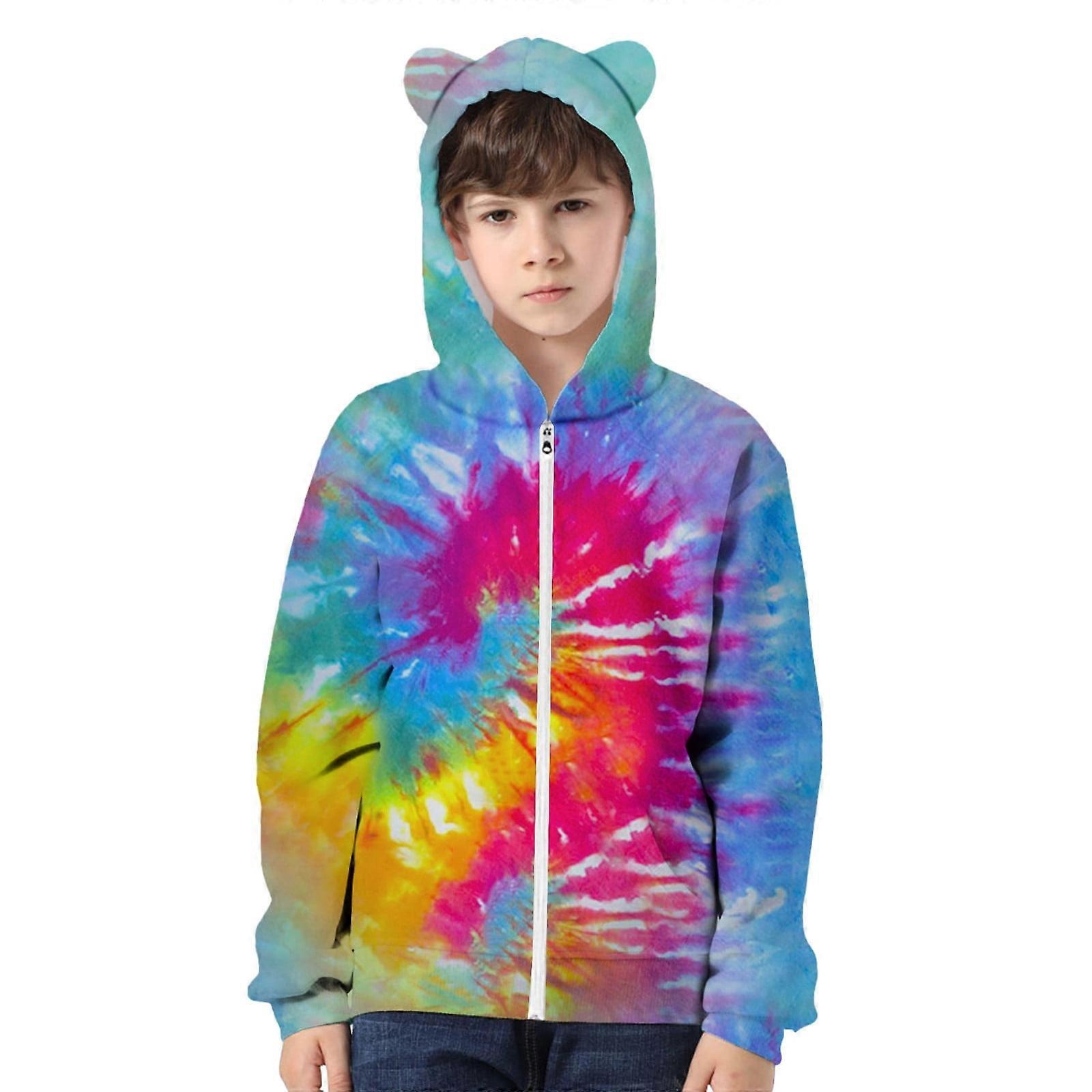 autumn and winter boy Tie Dye 3D Printed Cat Ears Zipper Hoodie For Children With Cat Ears Pullover For Girl And Boy Material: Polyester,Spandex Color: as the picture shows, (Due to the difference between different monitors, the picture may have slight color difference. please make sure you do not mind before ordering, Thank you!) Package weight: 350g Package size: 25x25x3cm,(Please allow 1-3mm error due to manual measurement. please make sure you do not mind before ordering.) Size chart: Size:100 Recommended age:18-24 Months Bust:68cm/26.77'' Sleeve:42cm/16.54'' Length:44cm/17.32'' Size:120 Recommended age:4-5 Years Bust:76cm/29.92'' Sleeve:46cm/18.11'' Length:50cm/19.69'' Size:130 Recommended age:5-6 Years Bust:80cm/31.50'' Sleeve:49cm/19.29'' Length:53cm/20.87'' Size:140 Recommended age:6-7 Years Bust:84cm/33.07'' Sleeve:52cm/20.47'' Length:56cm/22.05'' Size:150 Recommended age:8-9 Years Bust:88cm/34.65'' Sleeve:55cm/21.65'' Length:59cm/23.23'' Size:160 Recommended age:10-11 Years Bust:92cm/36.22'' Sleeve:57cm/22.44'' Length:62cm/24.41'' Size:170 Recommended age:12-13 Years Bust:96cm/37.80'' Sleeve:59cm/23.23'' Length:65cm/25.59'' Package Include:1PC Sweatshirt Suitable For Any Occasion,outfit Fit For Seasons In Autumn And Winter. It Is For Indoor, Outdoor Wear, Baby Photography,baby Gifts Etc. Provide The Comfort Experience For Baby Wear. Fashion Design,your Little Baby Will Get Lot Of Compliments. Materials Bring Better Wearing Experience.Soft Breathable And Flexible To Your Baby's Skin.Both Hand-wash And Machine-wash Are Ok. Please Allow Slight 1-3cm Difference Due To Manual Measurement And A Little Color Variation For Different Display Setting