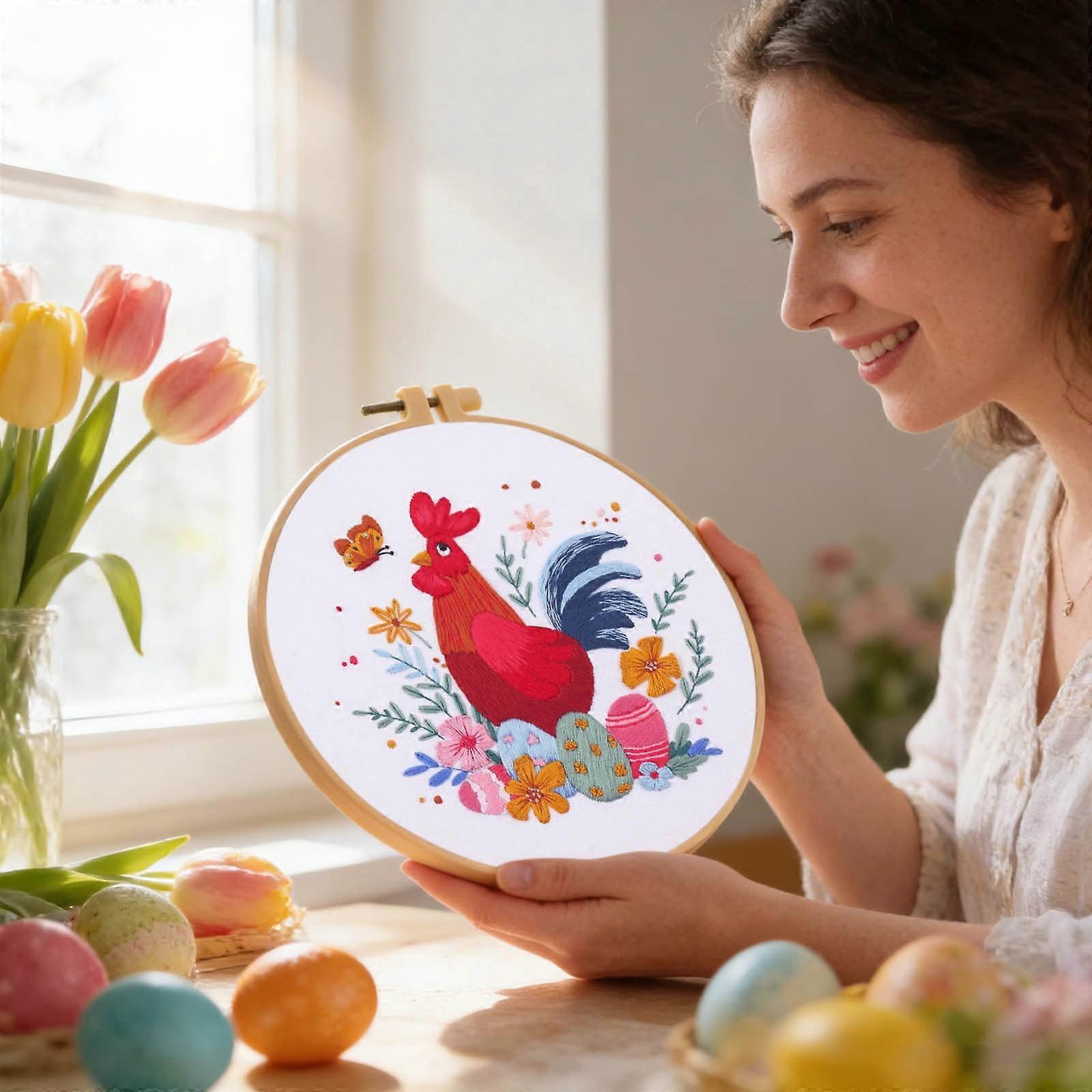 Spring Chick Embroidery Set, 7.9 in Baby Chicken Pattern Needlework Kit for Kids, DIY Easter Craft Cross Stitch Hoop Art Decoration Style B