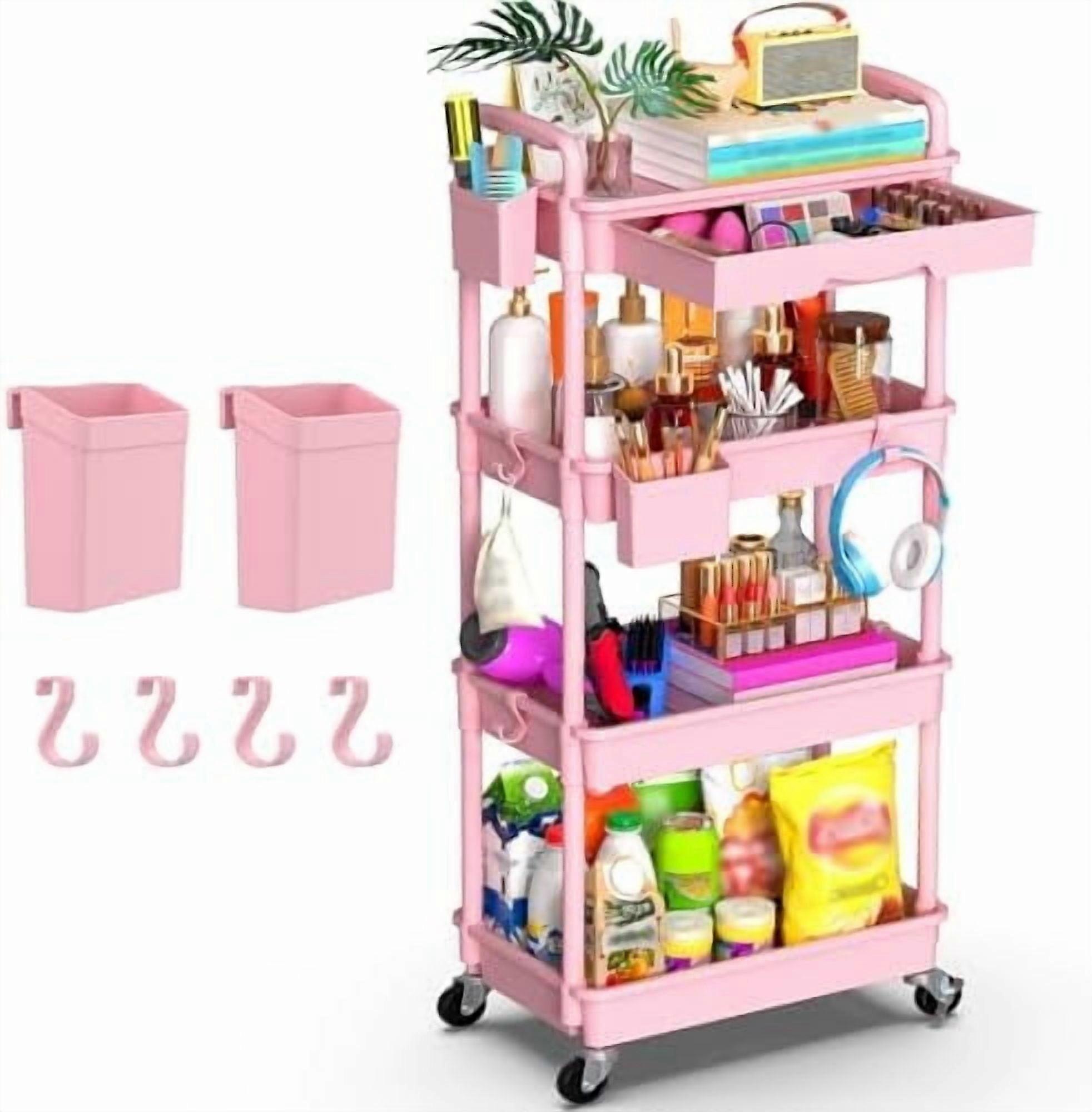 4-Tier Rolling Utility Cart with Removable Drawer, 2 Lockable Wheels, Pink – Compatible with Bathroom, Kitchen, Craft, Makeup & Baby Essentials