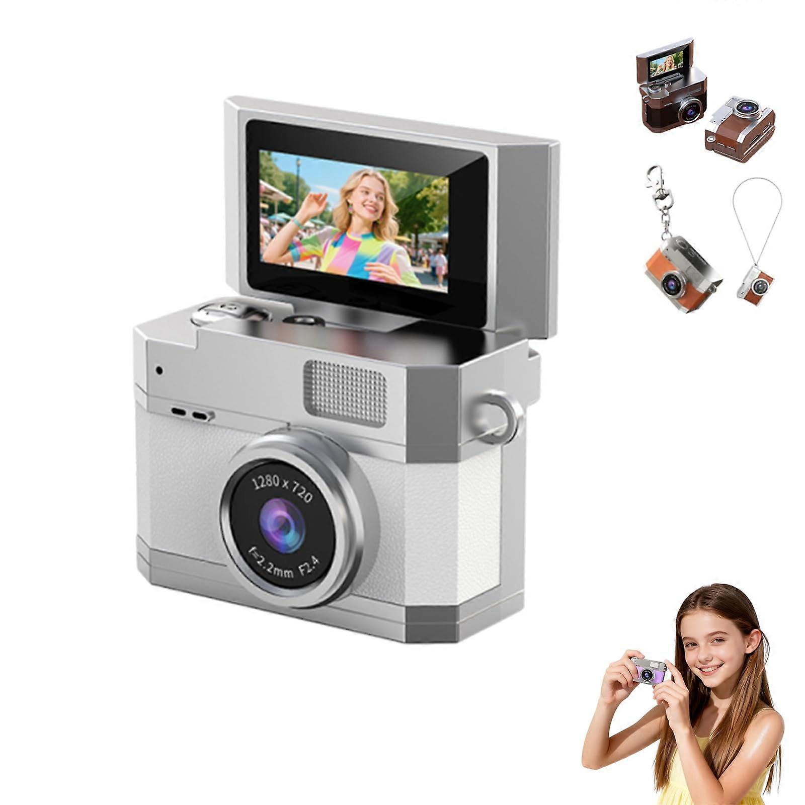 Thumb-Sized Flip Screen Mini Camera - Retro CCD HD Portable Pocket Camcorder Keychain, Compatible with Students & Campuses, White w/ 64GB Card