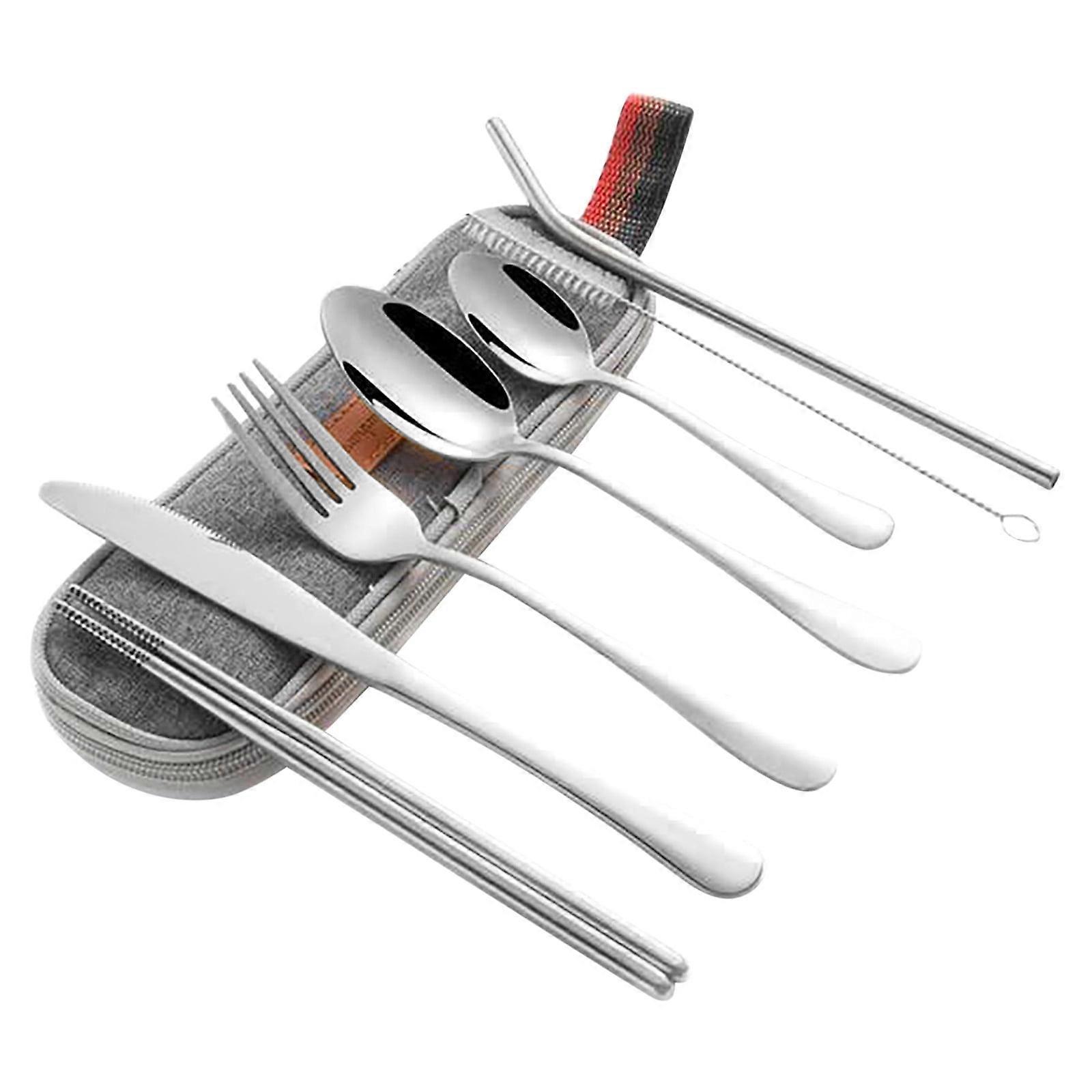 Travel Utensils Set, Camping Cutlery Kit, Stainless Steel, Knife Fork Spoon Chopsticks Straw, for Outdoor Picnics Hiking Travel, Silver, by FAJHHA