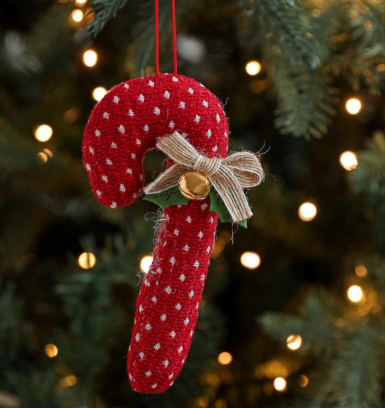 Christmas Tree Ornaments Set – Fabric Bow, Bells, Candy Cane – Red & White Holiday Decor for Tree, Wreaths, Gifts