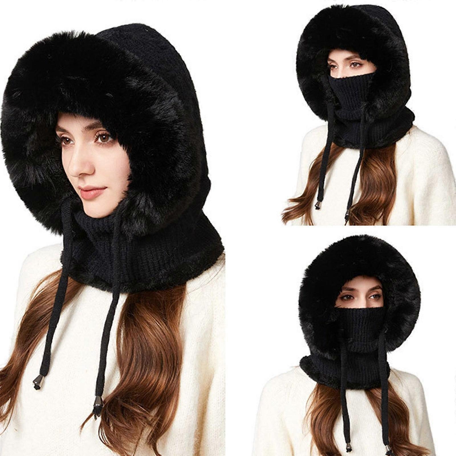 Women’s 3-in-1 Winter Trapper Hat with Knit Fleece Lining, Windproof Hooded Scarf & Face Cover – Black, compatible with cold weather activities