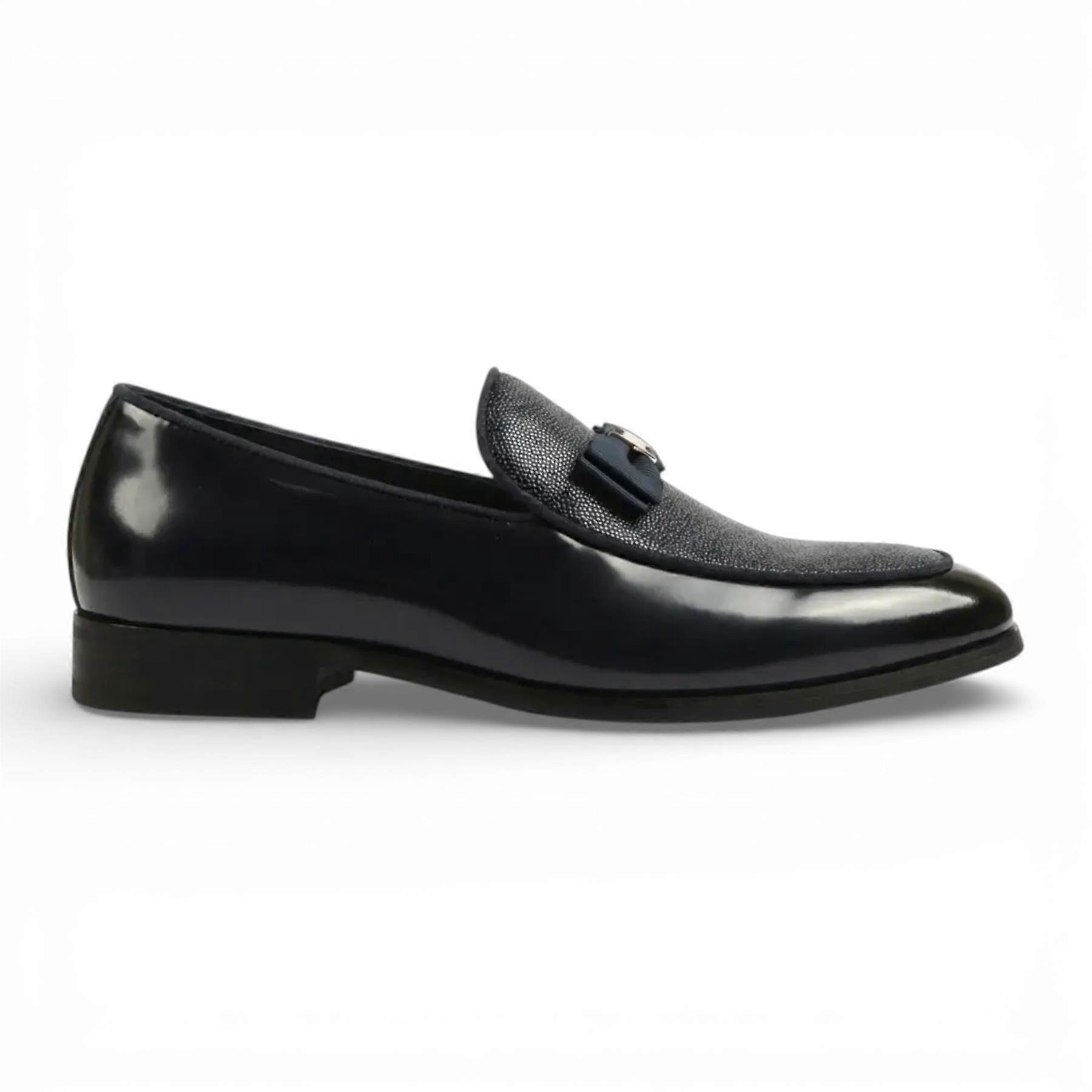 Mens Navy Blue Faux Leather Textured Front Iconic Buckle Bow Loafers Casual Shoes