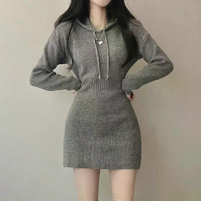 Sexy White Thicken Knit Mini Dress Woman Korean Elastic High Waist Bandage Dresses Women Hooded Outwear Long Sleeve Slim Dress