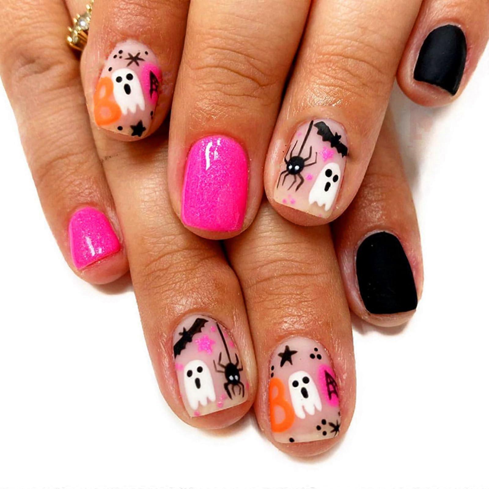 Pink Halloween Press On Nails Short Square Acrylic False Nails Cute Glossy Reusable DIY Kit