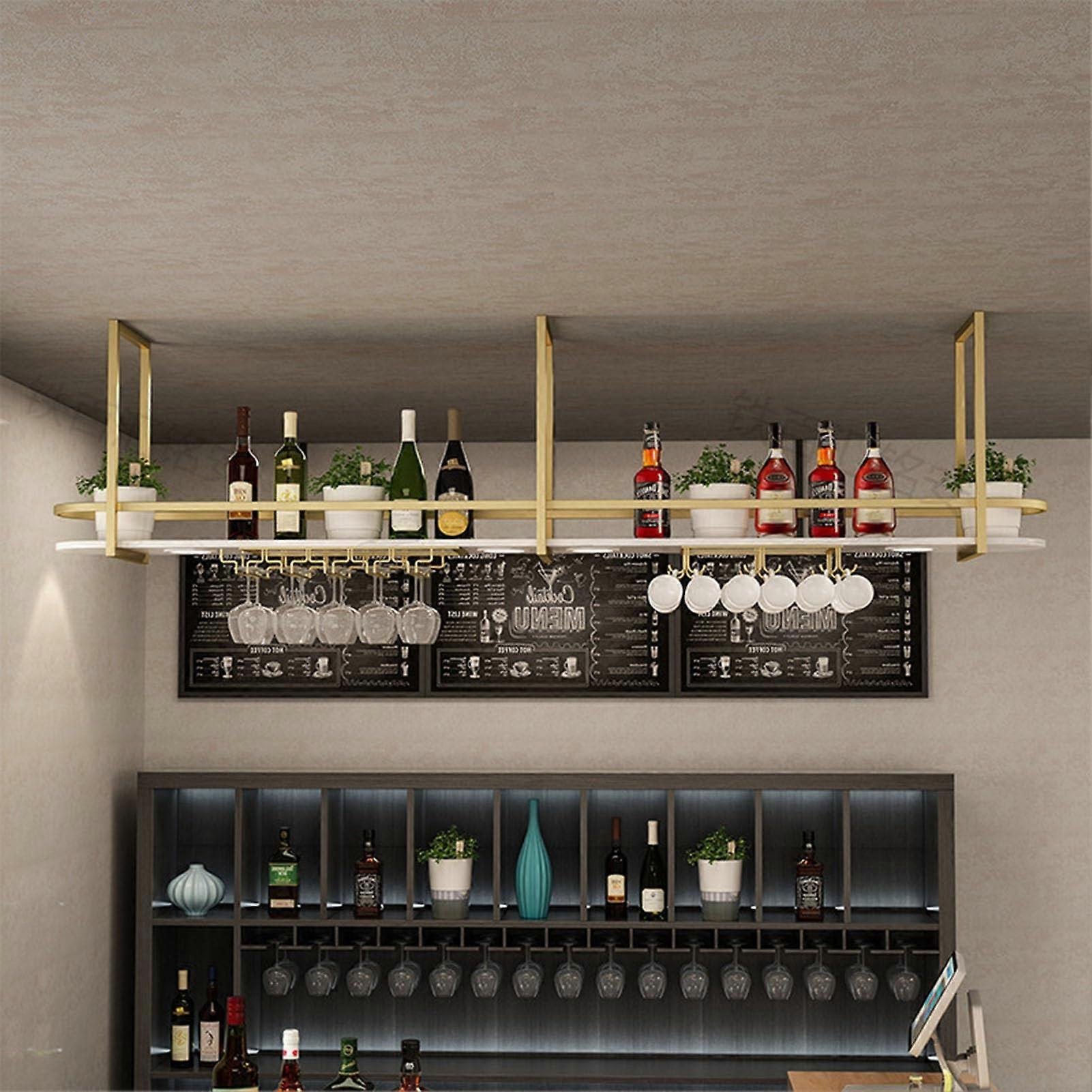 Gold Ceiling Wine Rack 150x30x50cm with Hanging Glass Holder and Metal Floating Shelves for Bar