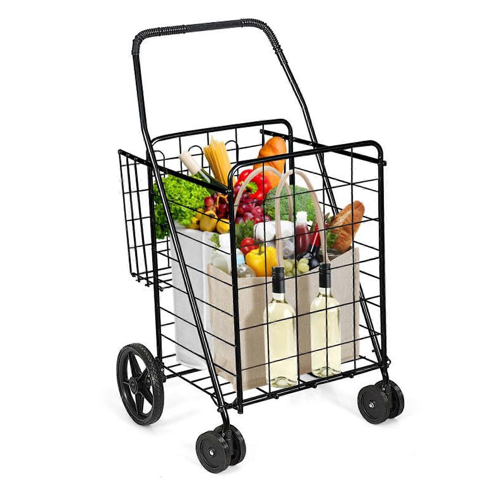 Foldable Utility Cart with Dual Basket Storage and 360° Swiveling Wheels, Lightweight Grocery Trolley, Black