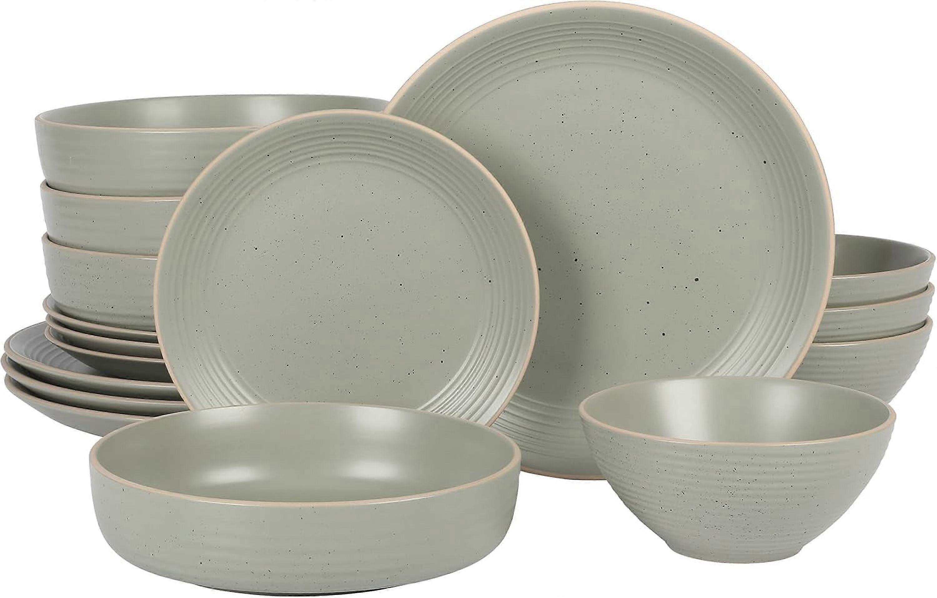 Dinah Double Bowl Stoneware Embossed Speckled Dinnerware Set - Sage Green, Service for Four (16pcs)