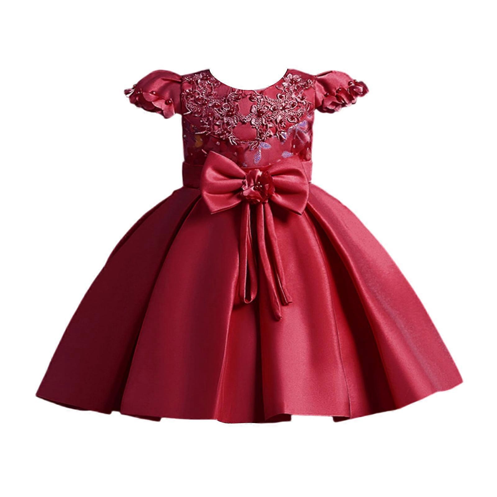 Girls' Deep Red Princess Gown with Floral Overlay, Bowknot & Pleated Skirt – for Special Occasions, Ages 4-6