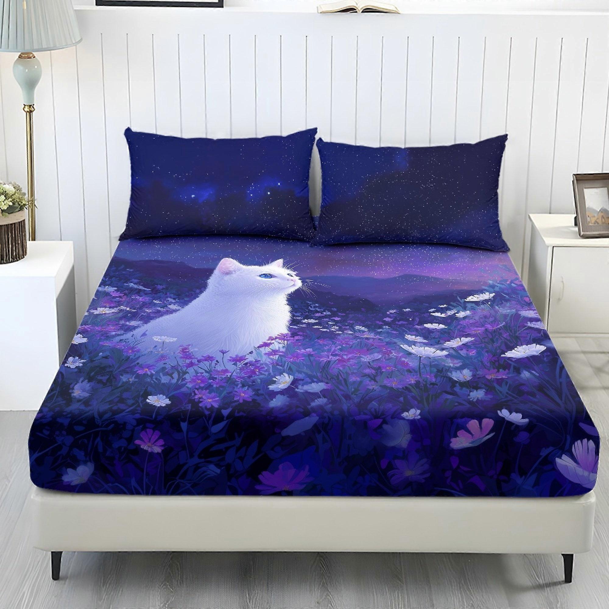 3-Pc Full Sheet Set with Soft Stretch Fabric, 1 Fitted Sheet + 2 Pillowcases – White Cat Flower Violet