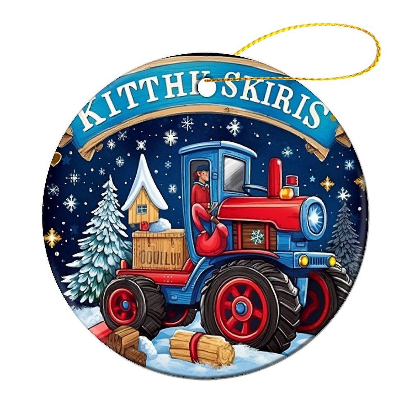 Wooden Christmas Ornament – Farm Tractor Pattern Bauble, Cartoon Trucks, Ceramic Round Decoration, Housewarming Gift (Compatible with Christmas