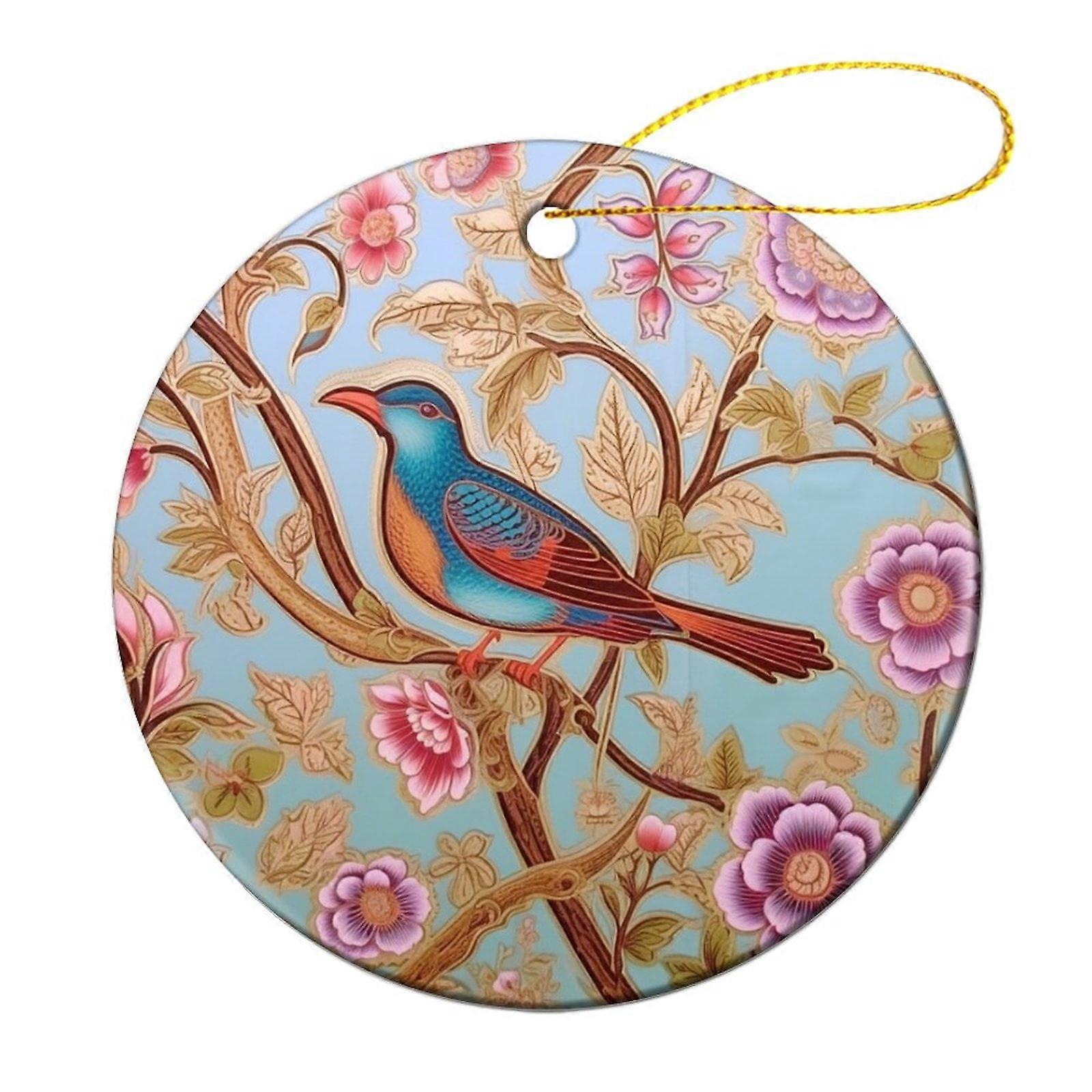 Victorian Birds & Flowers Ceramic Ornament, Beige Blossom Garden with Hummingbirds, Double-Sided Porcelain 3", Xmas Tree Decor & Gift