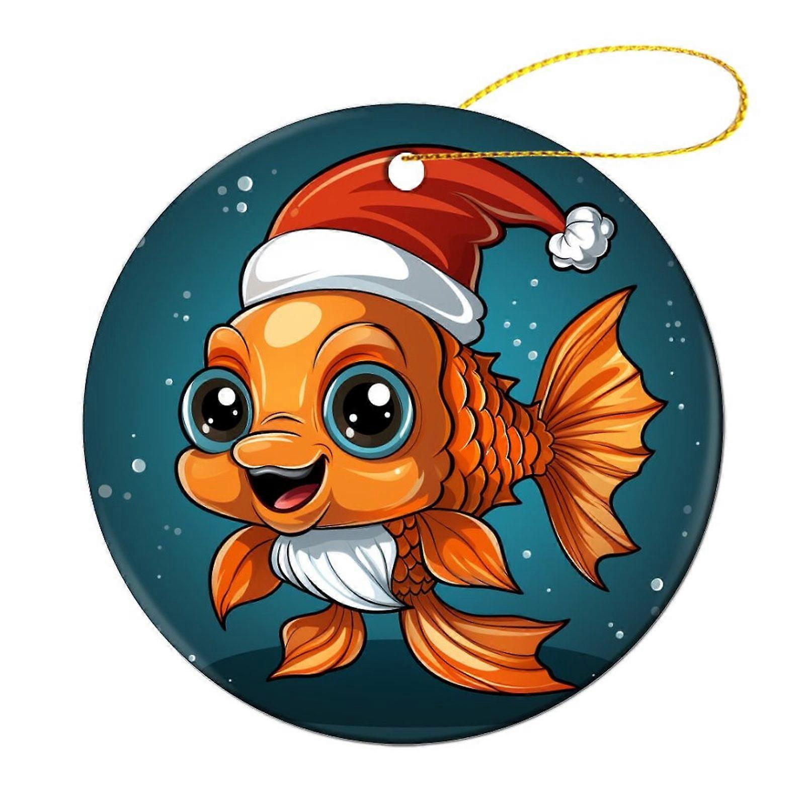 Watercolor Abstract Goldfish Xmas Ornament, Ceramic Round Decor with Red Santa Hat – Compatible with Christmas Tree