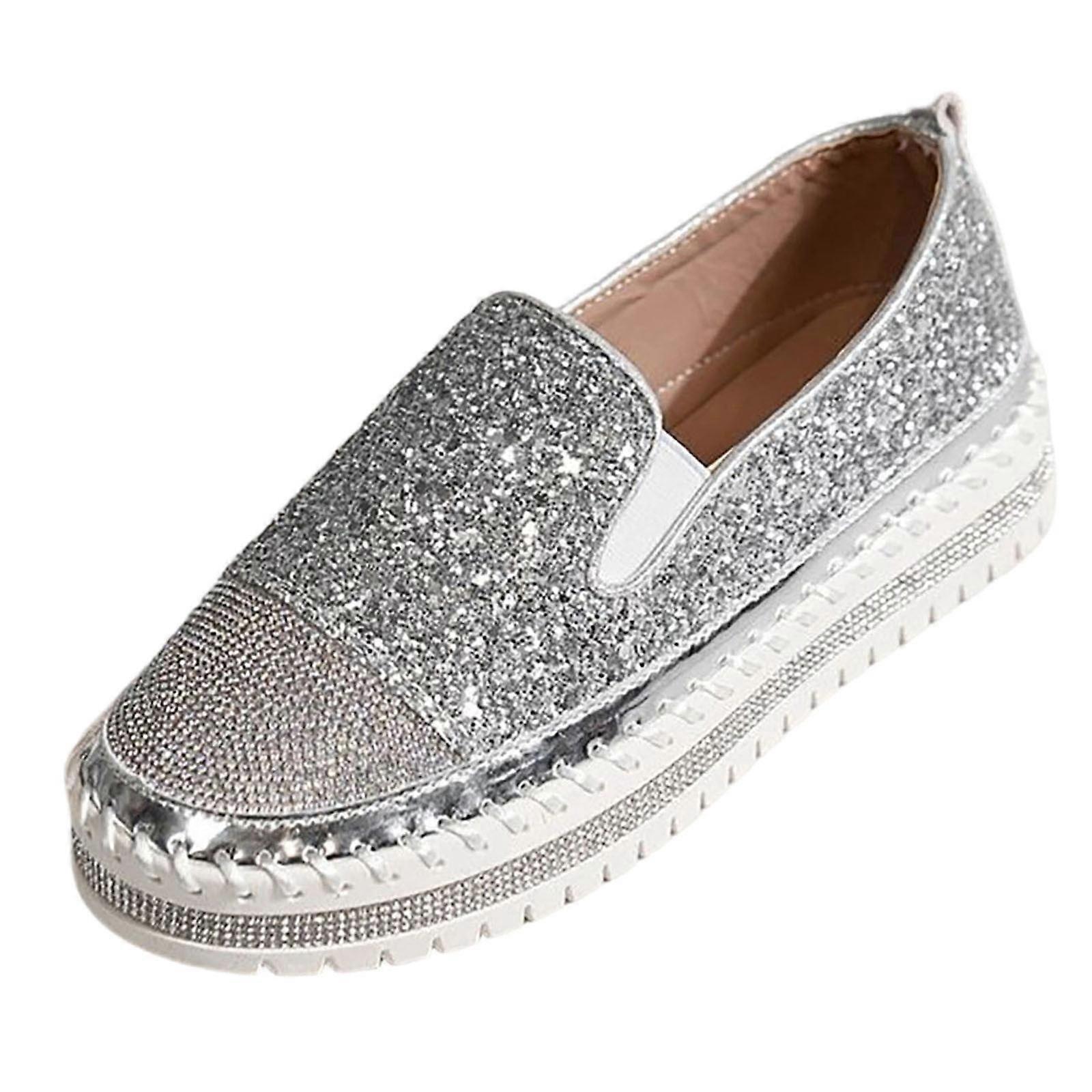 Silver Slip-On Loafers for Women, Rhinestone Decor, Platform Flats, Round Toe, Synthetic, EU41/UK6.5/US8.5, 10.04" Foot Length