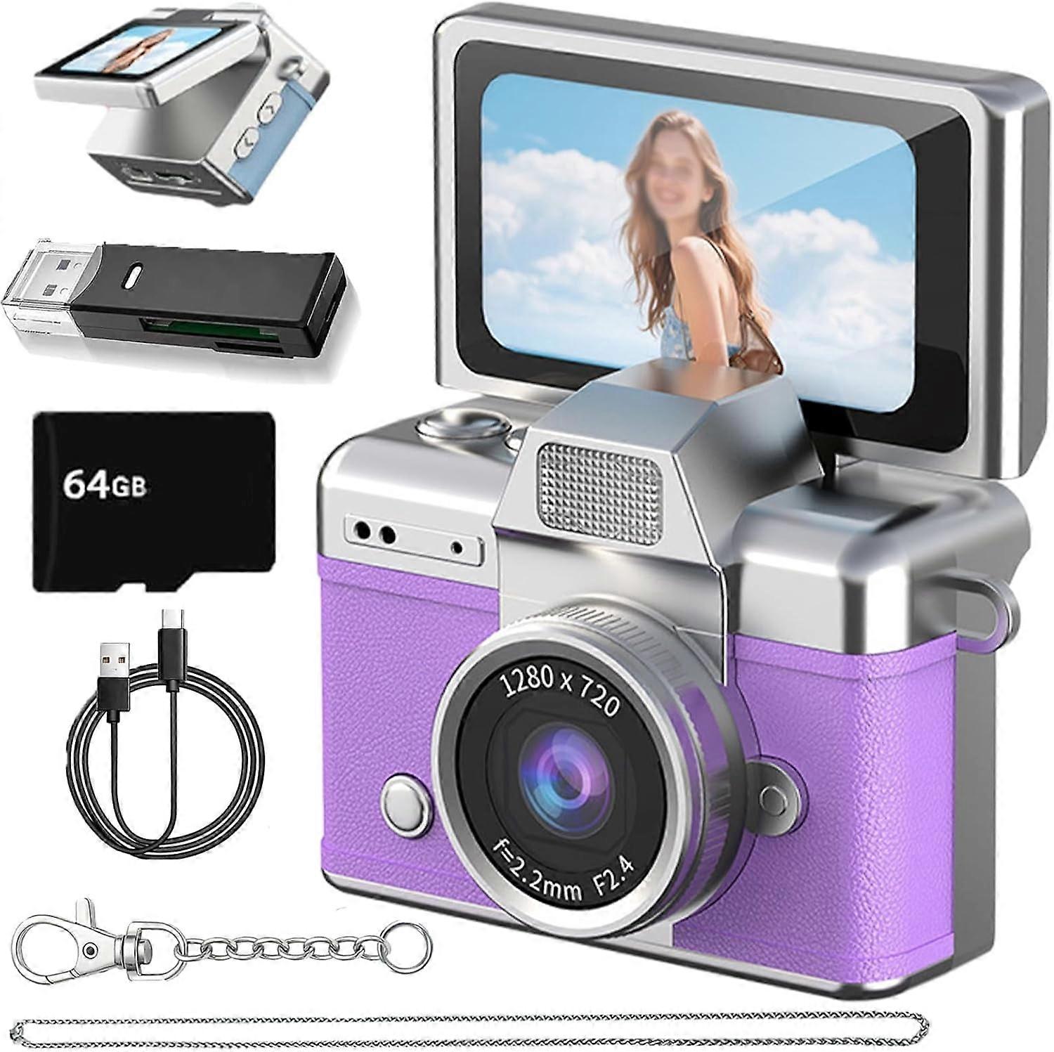 Mini Digital Camera with Flip Screen, 1080P Compact Camera with 1.47-Inch LCD Display, Keychain-Size Portable Camera with 64GB Card