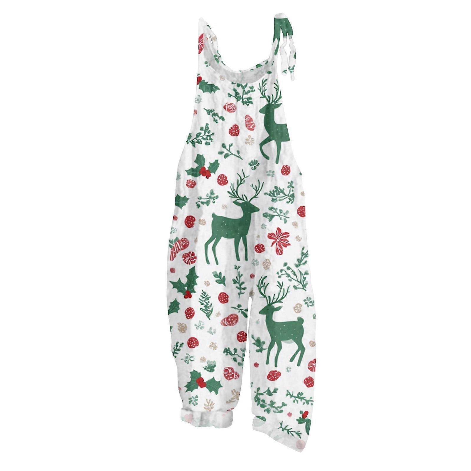 Women's Vintage Cotton Linen Overalls with Christmas Print - Casual Loose Jumpsuit with Shoulder Straps & Pockets, Army Green, Size XXL