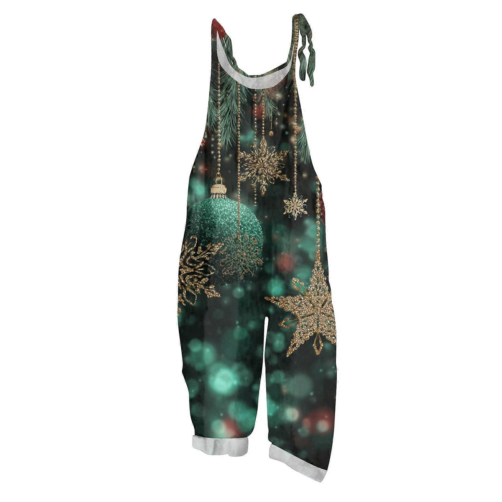 Women's Vintage Cotton Linen Overalls with Christmas Print - Casual Loose Jumpsuit with Shoulder Straps & Pockets, Army Green, Size XL