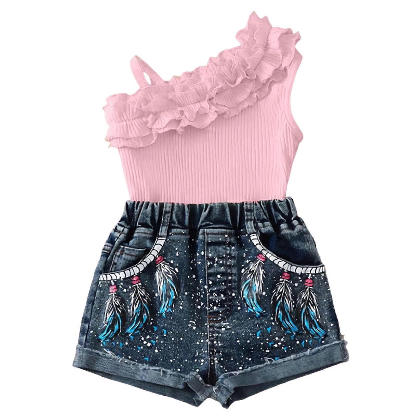 Girls Two Piece Set Pink One Shoulder Ruffle Top and High Waist Denim Shorts Kids Little Kid Summer Outfit Playwear Elastic Waist Rolled Hem Core Selling Point 1: Adorable and Trendy Two-Piece Set – Combines a feminine one-shoulder ruffle top with playful printed denim shorts for a cute, fashionable look that saves parents time on matching. Core Selling Point 2: All-Day Comfort and Durability – Made from soft, breathable polyester fabric that’s gentle on skin and built with reinforced stitching to withstand active play, machine washes, and frequent wear. Occasion 1: Casual & Playful Everyday - Perfect for a fun day out. Take your little one to the park, playground, or a weekend family outing in this comfortable and stylish set that allows for active movement while looking adorable. Occasion 2: Sweet & Stylish Celebrations - Ideal for birthday parties, casual family gatherings, or a special photoshoot. The unique ruffle top and trendy denim shorts create a charming, put-together look perfect for making memories. Product Type: Girls' Two-Piece Set (Top & Shorts) Target Age: 2 to 9 Years Old Material: 100% Polyester (Soft, Breathable & Easy Care)