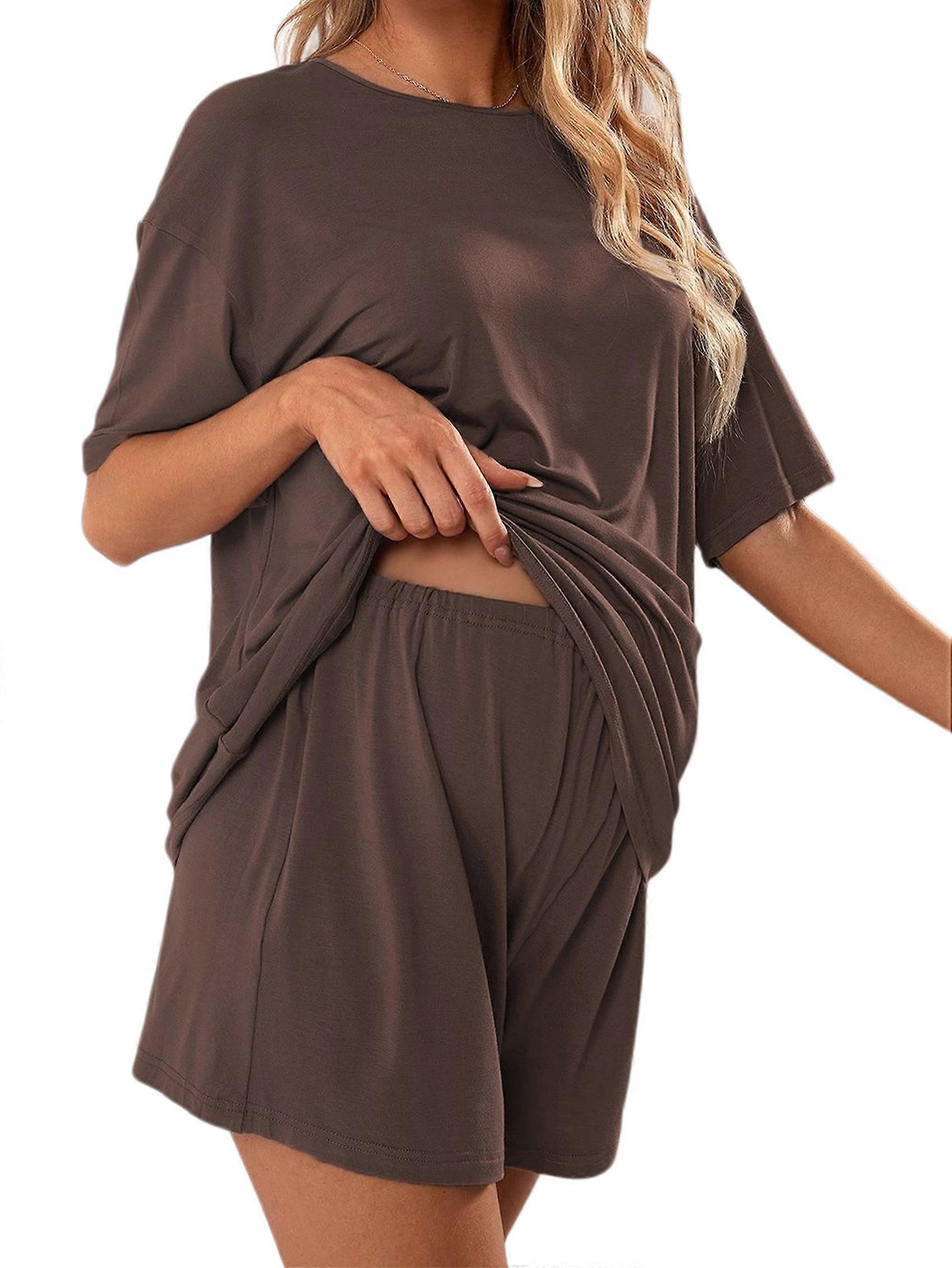 Women'S 2 Piece Lounge Set Short Sleeve Boxy T-Shirt & Shorts Summer Pajama Set Loungewear Set Brown M