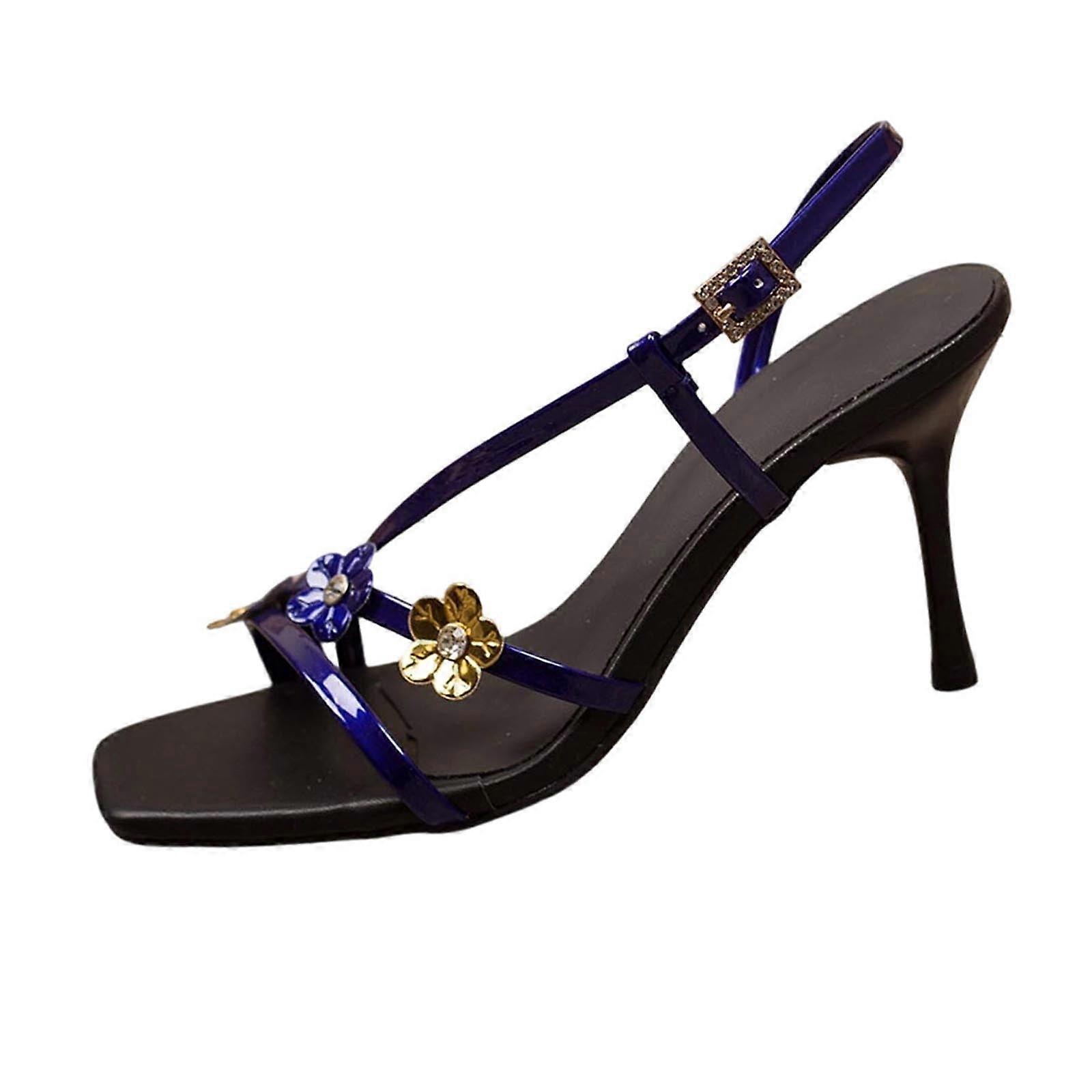 Blue Slides Shoes For Women Glitter Rhinestone Floral Decor Strappy Square Toe High Heels Spring Summer Casual Outdoor 3.35 Inches Heel Height Size 41 Material: PU Weight: 1.1 lbs Adult Women's Shoes