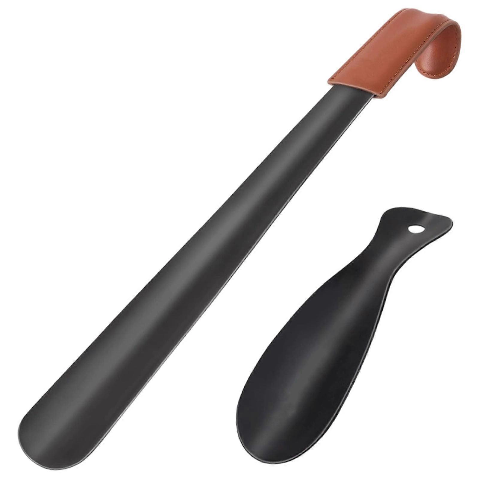 2 Pack Metal Shoe Horn, 16.5 inch Shoe Horn Long Handled for Seniors Men, Stainless Long Shoehorn for Boots, 7.5 inch Travel Small Shoe Horn with Hook for Women Kids Note Tips: 1. Please Allow 0~1 Inch Error Due to Manual Measurement.Thanks for Your Understanding. 2. Screen Are Not Calibrated Same, Item Color Displayed in Photos May Be Showing Slightly Different from the Real Object. lease Take the Real One as Standard. Travel Size: The 7.5-inch Shoe Horn Is Compact And Perfect For Travel, Fitting Easily Into Suitcases, Backpacks, Or Briefcases. Comfort Grip: Features A Soft Leather- Handle For A Comfortable Grip And Easy Hanging When Not In Use. Metal: Made From High-quality Metal, These Shoe Horns Are More And Wear- Than Plastic Alternatives. Long Handle: The 16.5-inch Shoe Horn Is Ideal For Seniors, Pregnant Women, And Those With Mobility Issues, Allowing Easy Shoe Wearing Without Bending Over. Pack: Includes two shoe horns, one long-handled (16.5 inches) and one travel-sized (7.5 inches).