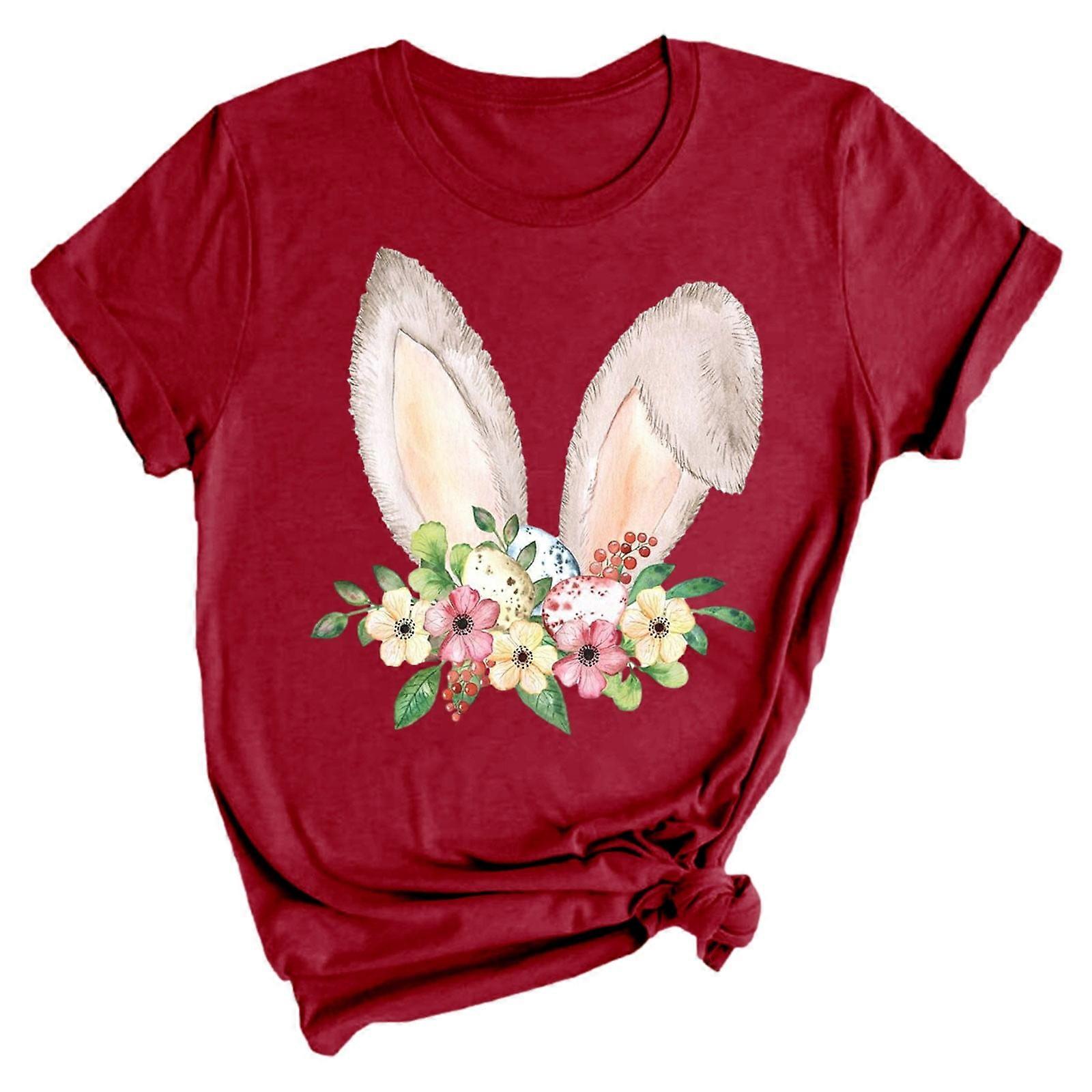 Graphic Tees Women, Spring Shirts for Women, Womens Easter Outfit, Bunny Floral Easter Print Round Neck Short Sleeve Top, Womens Tops, Red 2 L