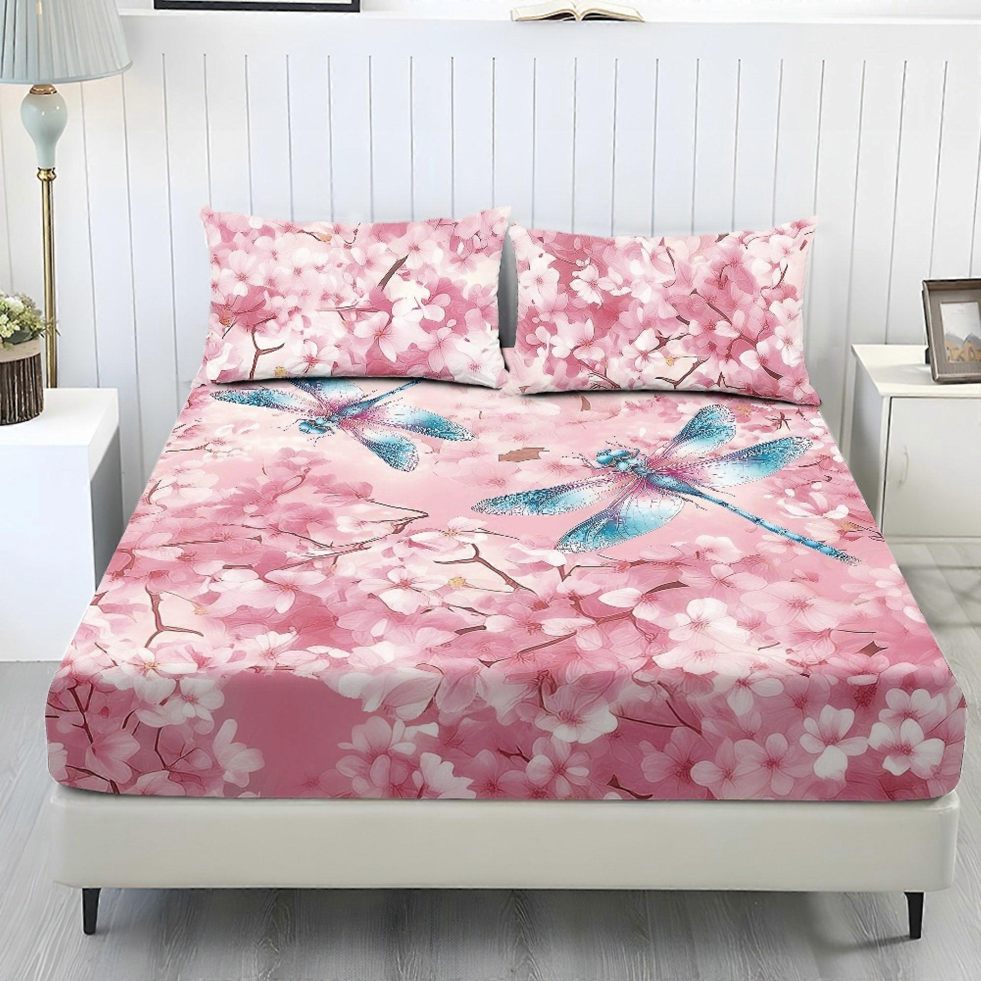 3-Piece Twin Sheet Set, Dragonfly Pink Flower Print Cooling Sheets, Soft Cozy 9.8" Pocket Twin Sheets with Pillowcases, Easy-Care All-Season Bedding