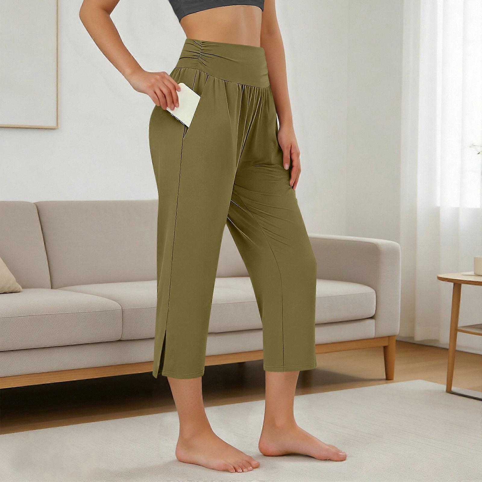 Women's Yoga Capri Pants with Pockets Pleated Detail Elastic Waistband Side Slit Casual Lounge Athletic Wear