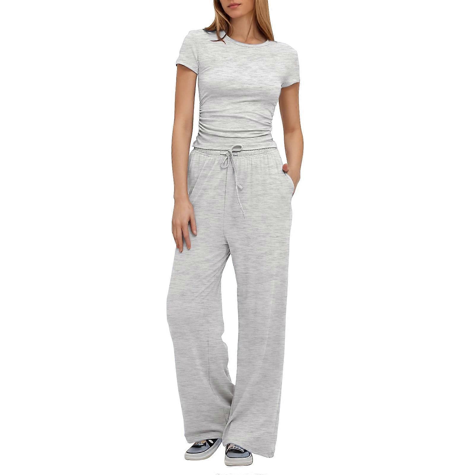 Women's 2-Piece Lounge Set: Ruched Top & High-Waisted Wide-Leg Pants – Gray, S (Compatible with Air Travel)