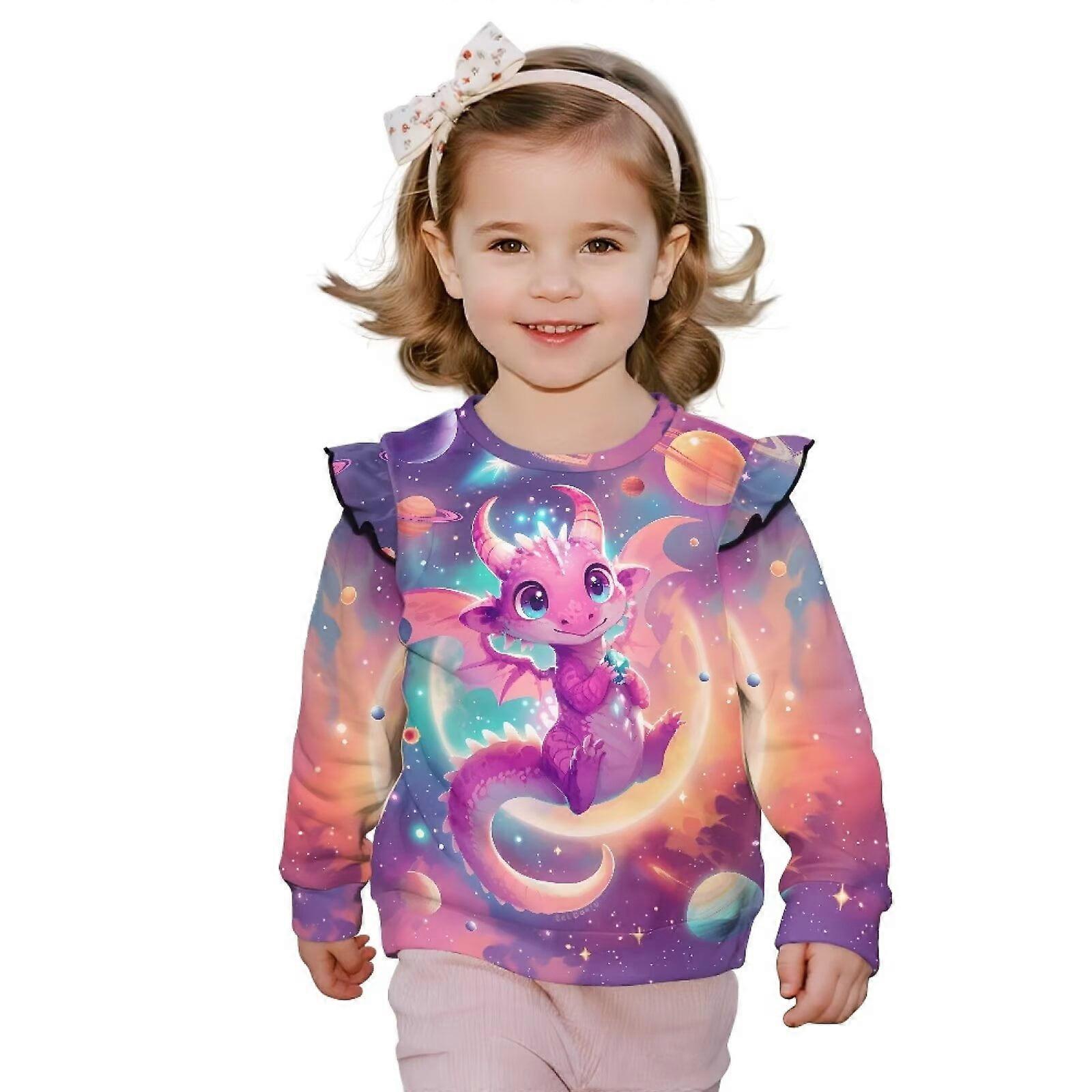 Pink Dragon Planet Ruffled Shoulder Sweatshirt for Girls – Long Sleeve Casual Pullover, Compatible with Kids' Oversized Styles