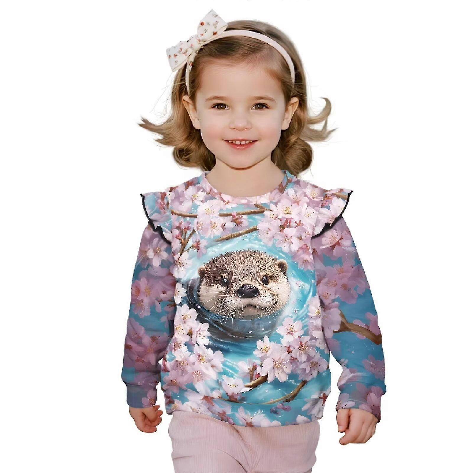 Girls' Cherry Blossom Otter Pullover Sweatshirt, Long Sleeve Crewneck, Athletic Sweater for Fall – Size 4-5, compatible with school uniforms