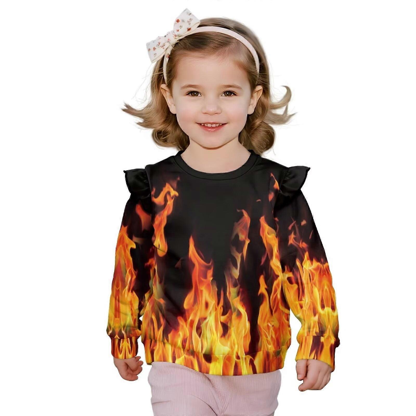 Fire Print Ruffle Shoulder Sweatshirt for Toddler Girls 2-3T, Long Sleeve Hoodie Top – Fall/Winter/Spring, Compatible with Kids' Casual Wear